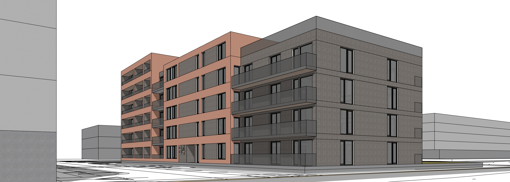 modernist exterior shot render a modern apartment complex in an urban setting the left side of the building features a warm terracotta color with large windows giving it a contemporary and inviting look the right side is clad in a sleek slate gray offering a sophisticated contrast add metallic gray balconies for a touch of elegance create a bright and clear atmosphere with a vibrant blue sky incorporate subtle greenery around the building to add natural texture enhancing the overall aesthetic appeal architecture