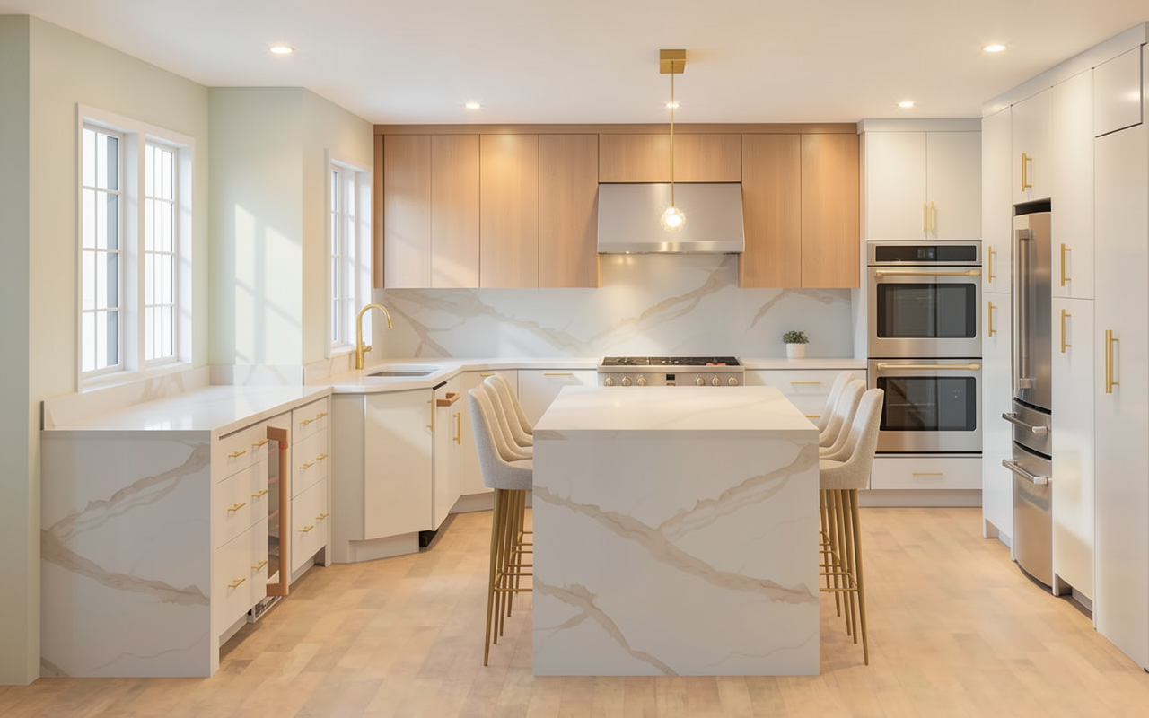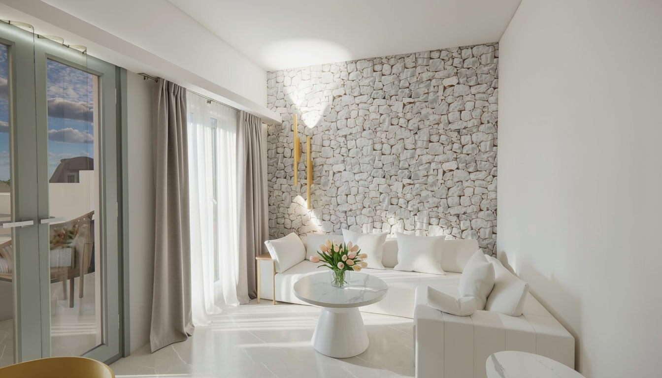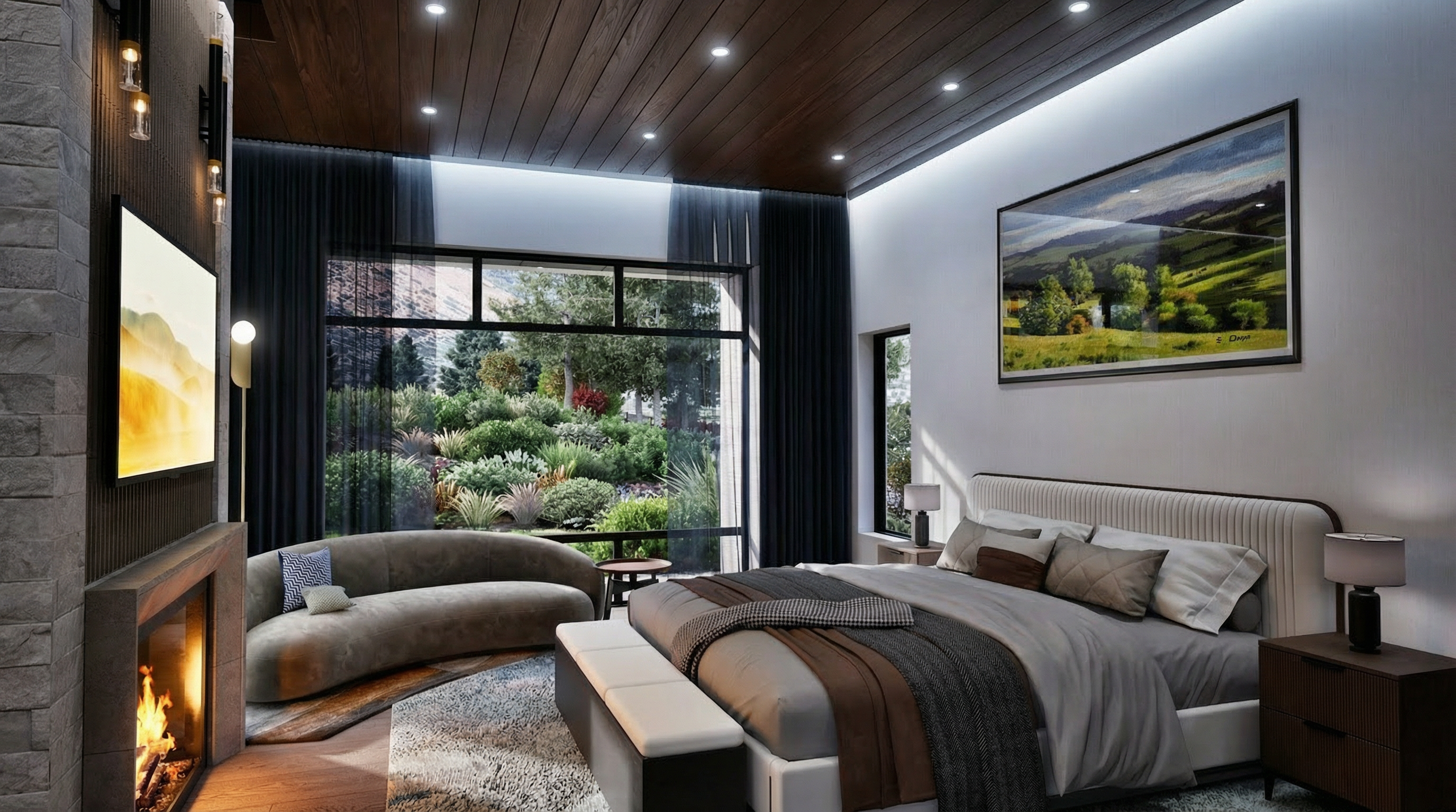 render a photorealistic 3d perspective of this house in a park ridge il reference the current materials and style just enhance them black asphalt roof and soffits black shiplap cement board siding beige stone veneer base and black window frames keep model geometry the same windows doors roof walls concrete driveway around the house on the right use marked vegetation that looks native to park ridge il do not change the view add a car partially behind the right corner only enhance the current materials and make the landscape realistic detailed textures in the lap siding and glass reflections and a vibrant clear sky with light atmospheric depth and few clouds render in hyper realistic architectural visualization quality 8k resolution