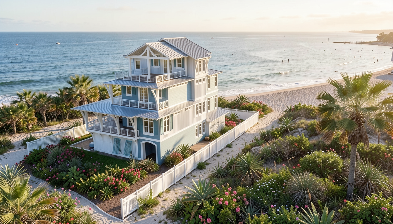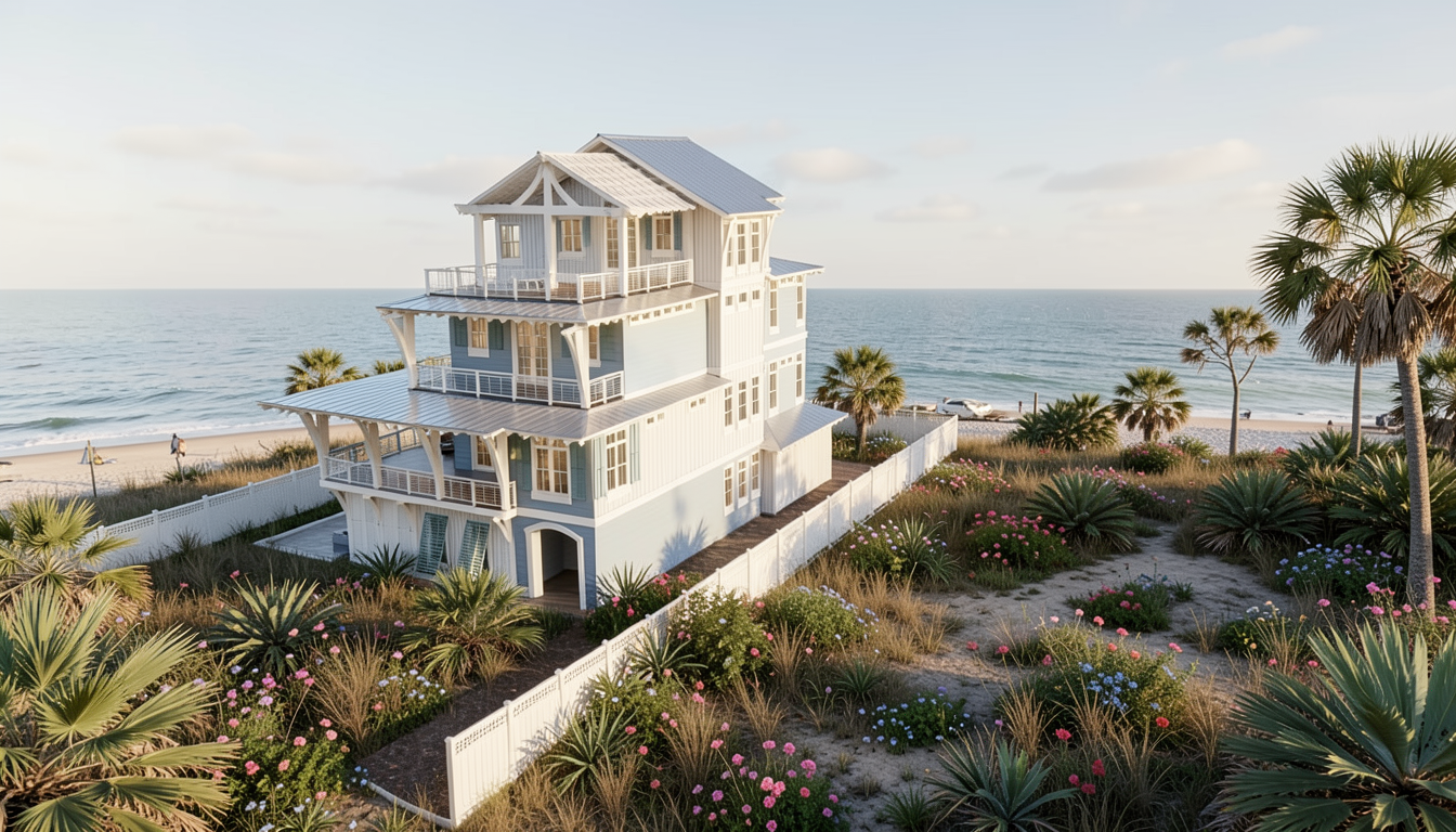 you are a professional rendering artist with the highest grade renderings in the country you are hired to render this beach house which will be built in pass christian mississippi render all walls exactly as they are where they are render all windows exactly as they are where they are very minimally landscape with hardy plants and flowers that are native to mississippi and require little to no maintenance this is an afternoon scene for a beachfront home