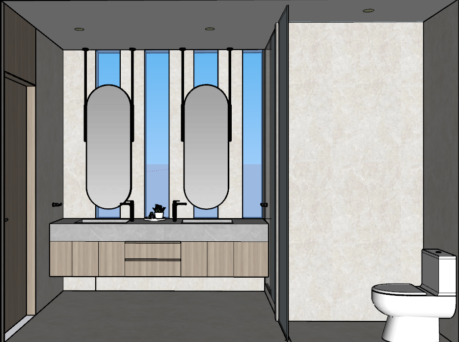 a modern bathroom interior featuring a symmetrical design with two sinks the sinks are sleek and white paired with elegant black faucets above the sinks are smooth white cabinets providing a clean and minimalist look the backsplash is adorned with sophisticated gray and white marble adding a touch of luxury underneath a warm soft light glows subtly from a concealed source enhancing the marble s texture the countertop is a continuation of the marble pattern paired with light wooden cabinetry that complements the neutral tones the walls are a refined mixture of dark gray and wood providing a balanced contrast the overall atmosphere is serene and sophisticated with a focus on clean lines and elegantly blended textures and colors