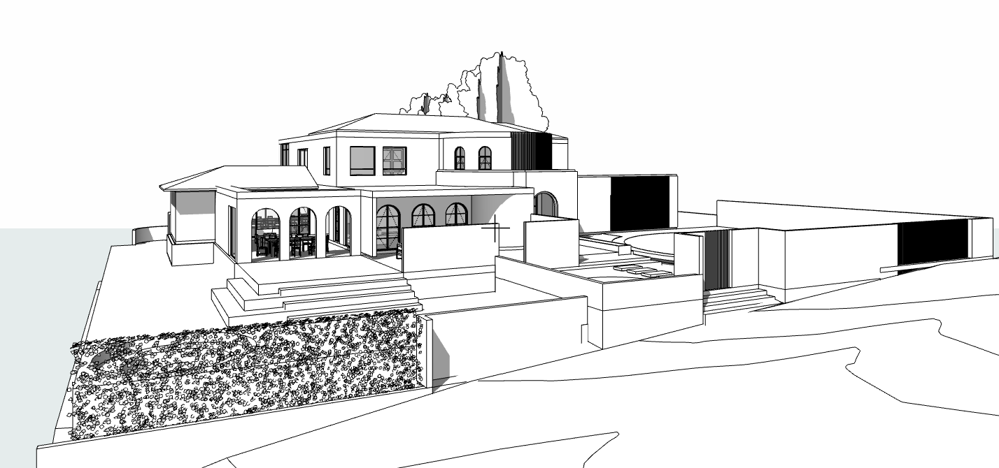 perspective shot keeping the exact design and proportions from the original render the building in a modern mediterranean style with white plaster walls black joinery glass balustrades with a simple single steel handrail and balusters include a country road landscape in the foreground hills in background