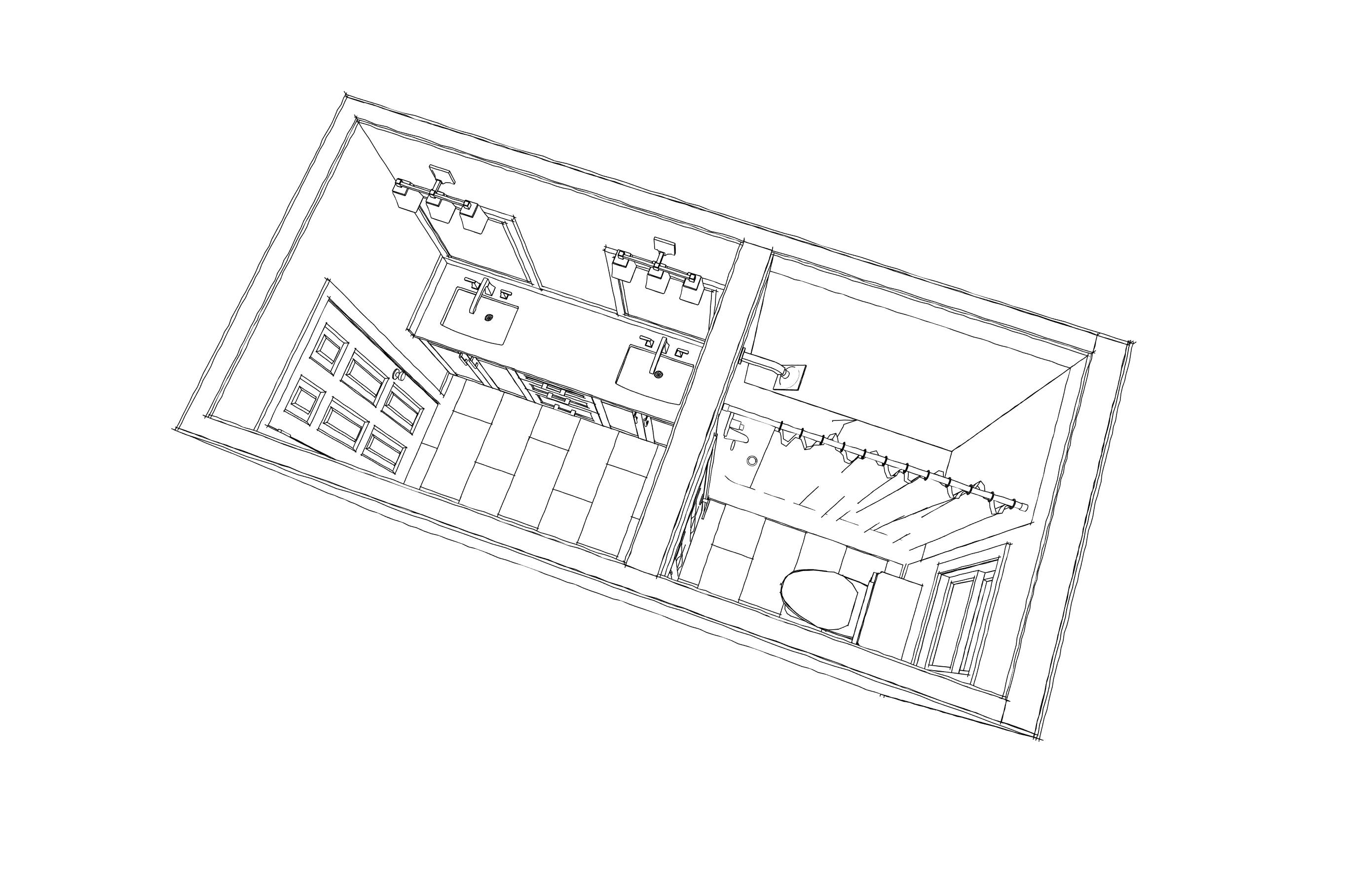 white marble 12x24 tile floor light greige countertop sherwin williams iron ore cabients two vanity lights two light fixutres and white tub shower unit