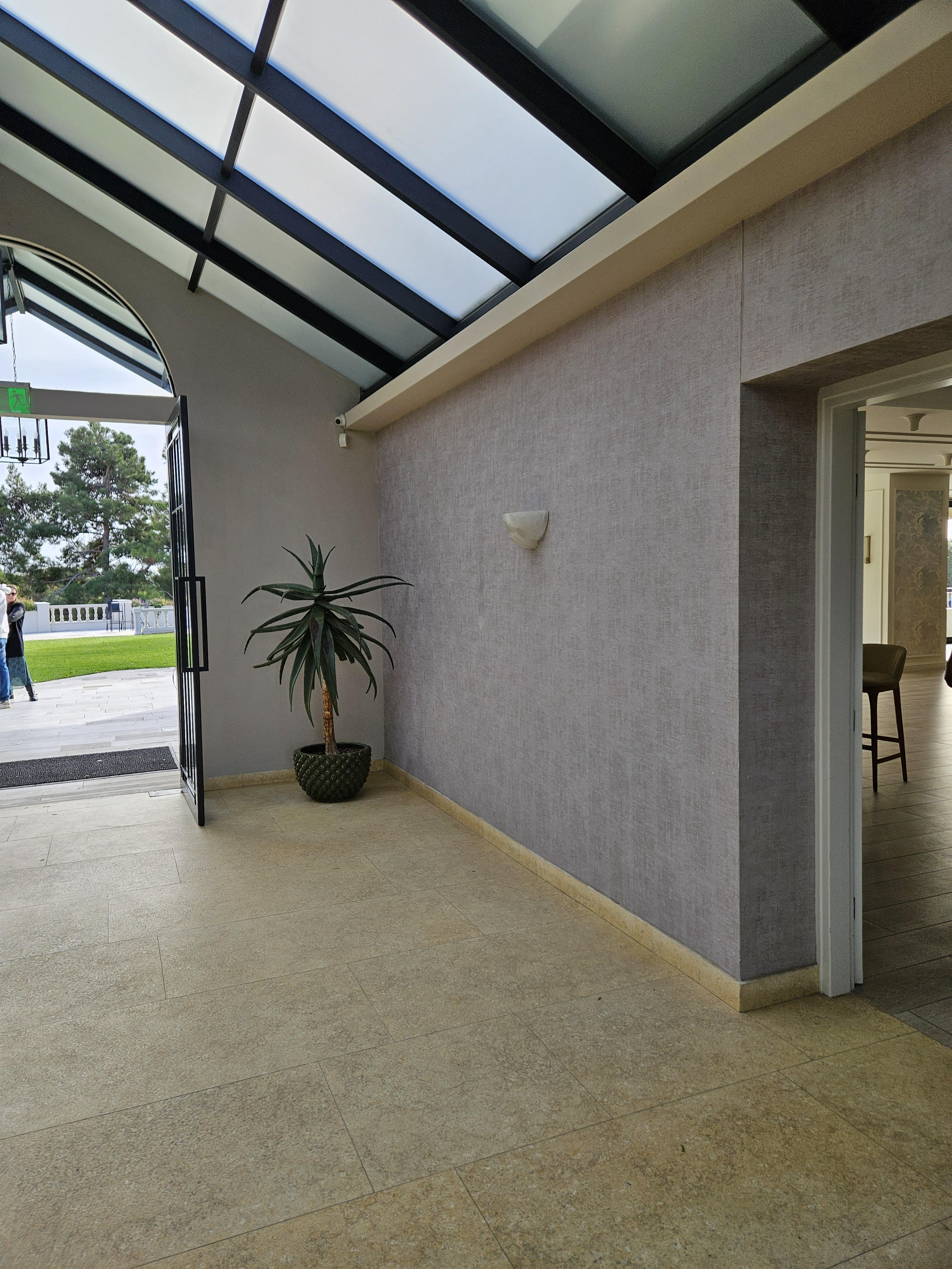 place a grey table standing against the wall covering 3 4 of the distance then place on the table many small bottles of lemon juice and fuschia lemonade juice the small bottles have to be one row of one color another color of another color