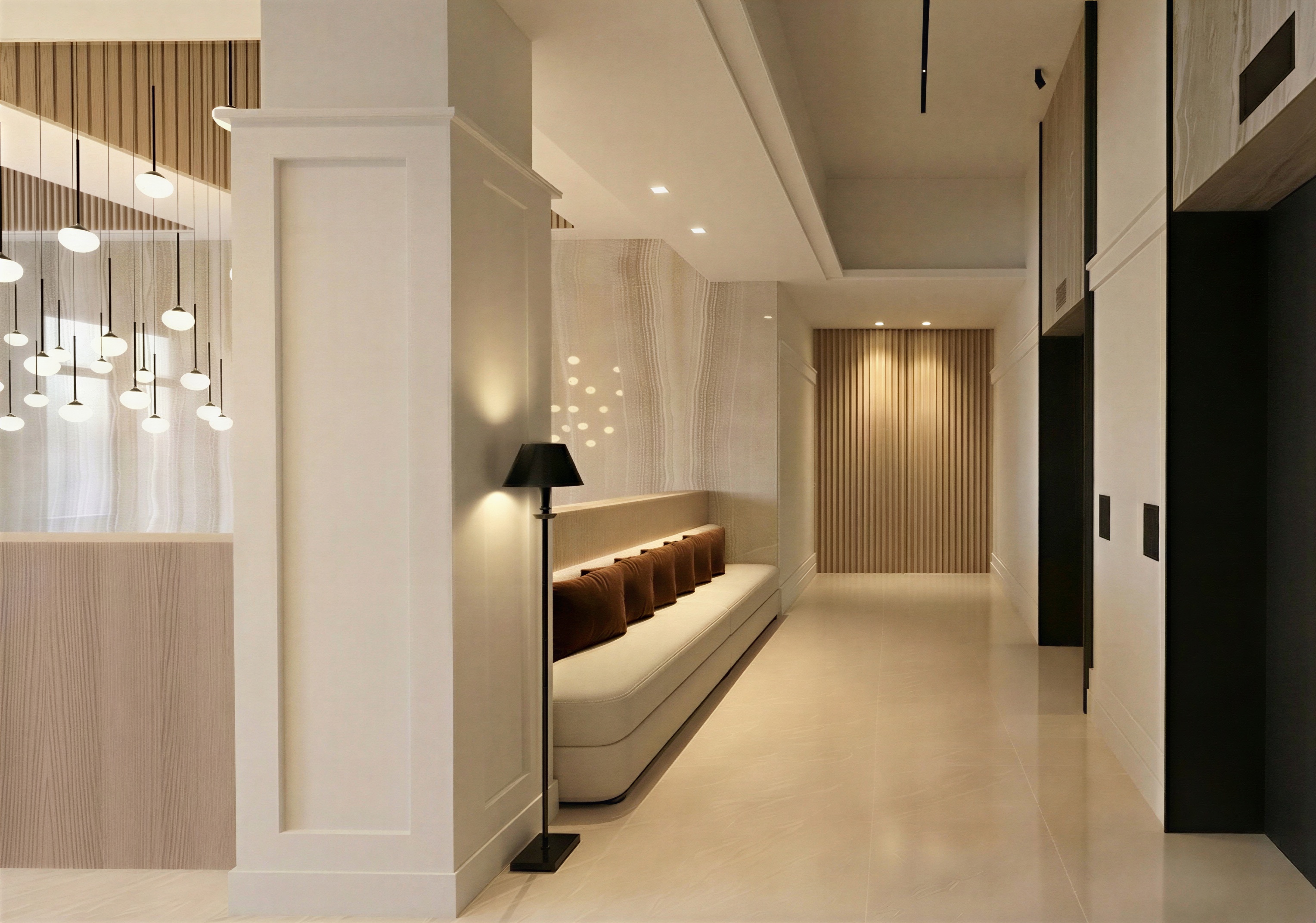 le parti metalliche scure sono in acciaio scuro quasi nero spot di luce sopra ogni ascensore