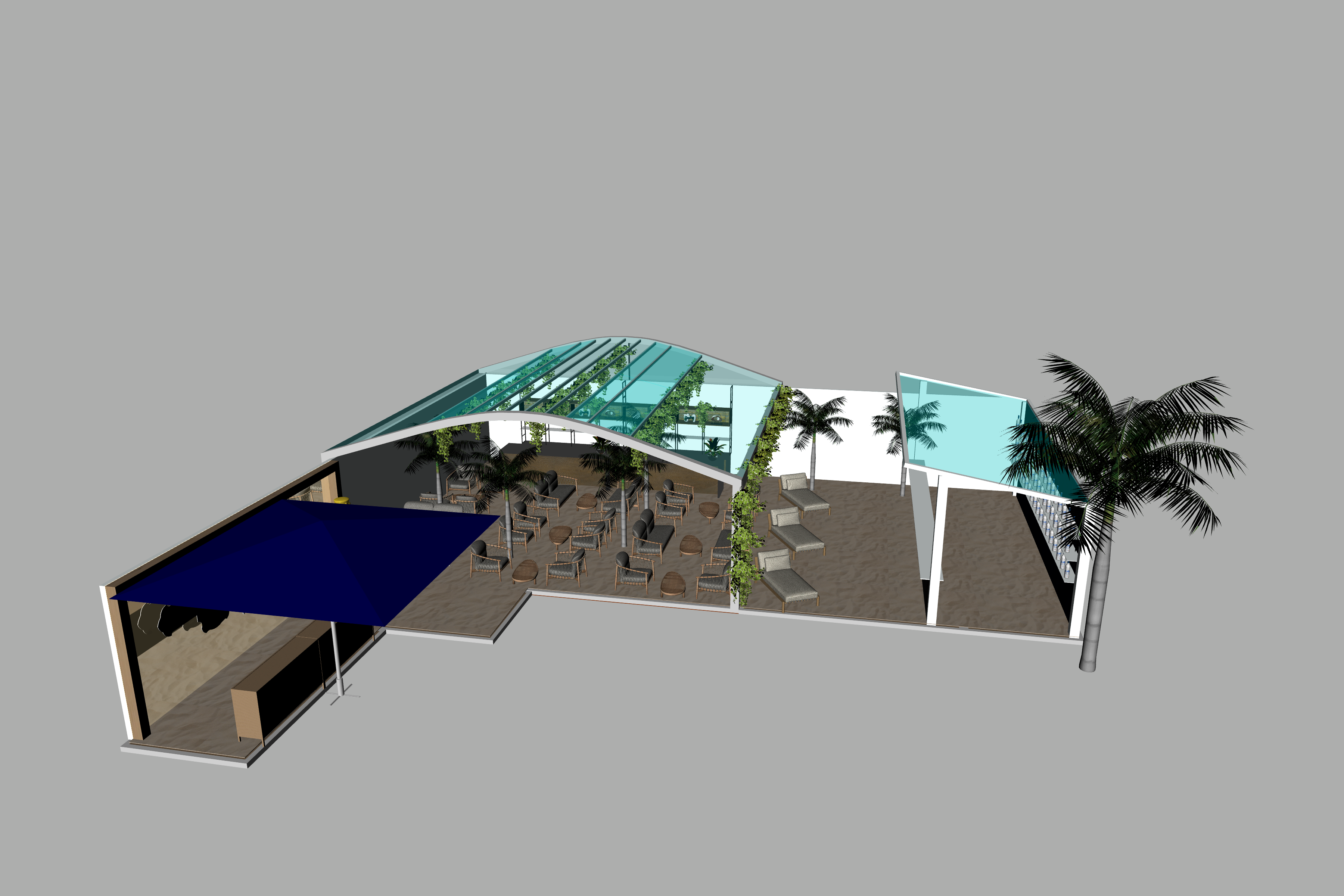 the location is in a park with lots of greenery the wheater is sunny and people are sitting on the furniture the white parts in the design are non see trough smooth white walls