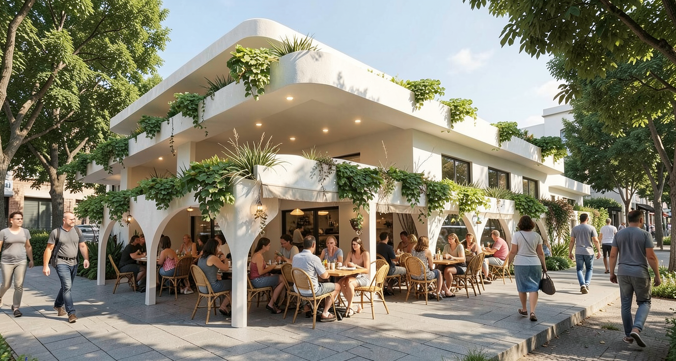 place loose outdoor cafe furniture under the arched awning populate with people eating on the seats and have people walking by on the footpath outside the awning do not have cafe seating on the right side of the building don t add any trees