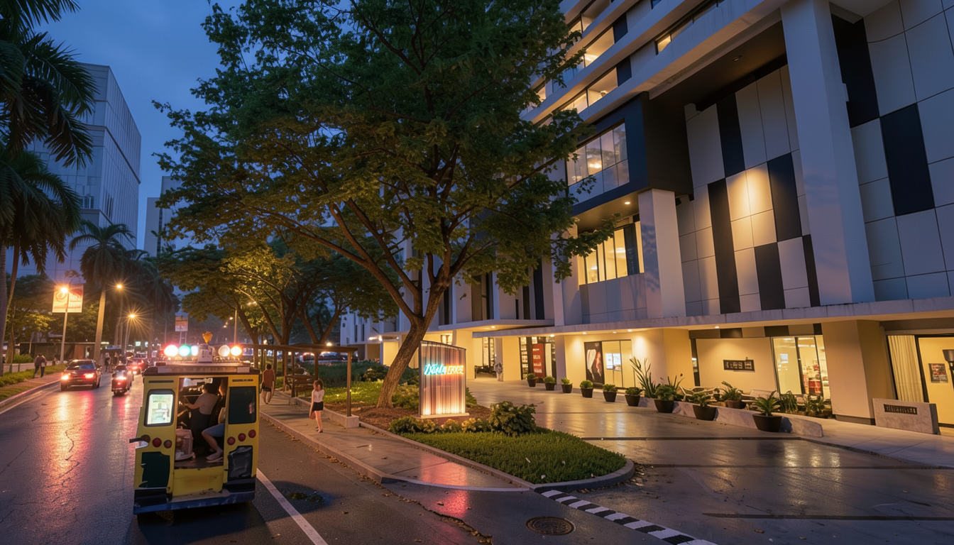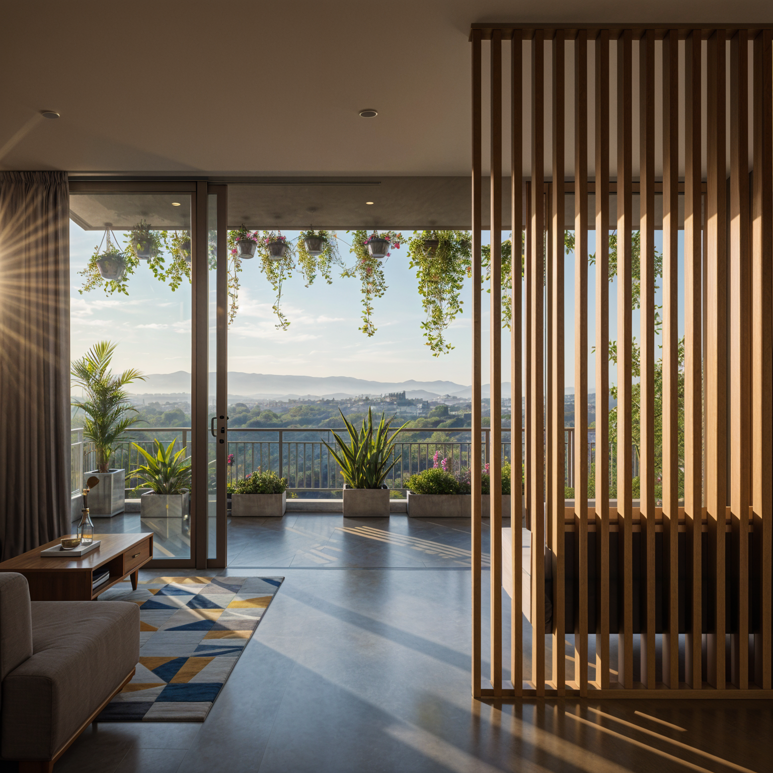 asphalt road and concrete sidewalk sunset lighting modern contemporary materials in warm gray tones wood slats in the facade cinematic photorealistic 4k resolution 16mm camera lens san mateo rizal valley in the far background add planters hanging plants in every balcony looks like a real estate photograph not a 3d render looks like a real estate photograph not a 3d render