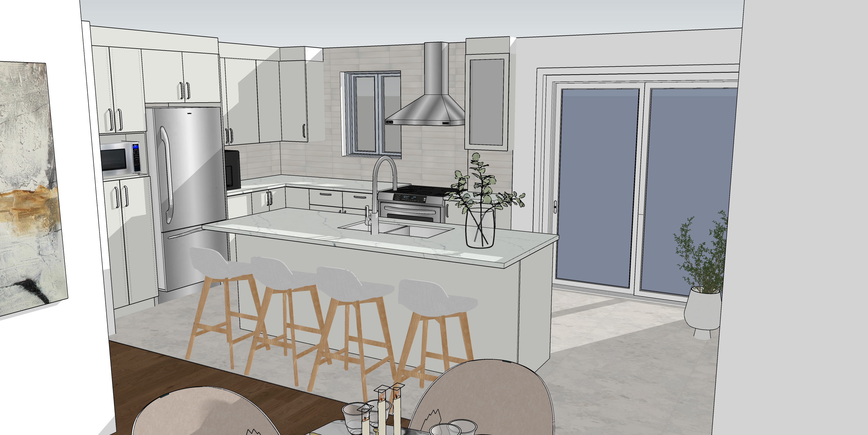 keep geometry render a modern stylish kitchen with an airy and inviting atmosphere use soothing white and cream tones for the cabinets and walls giving a fresh clean feel accentuate with stainless steel appliances like the fridge and oven adding a sleek contemporary contrast incorporate light wooden elements for the bar stools adding warmth to the space introduce a touch of greenery in a clear vase on the white marble countertop for a natural element use a soft gray tile for the floor enhancing the light and open ambiance the artwork on the wall should have muted earth tones complementing the natural color scheme the overall atmosphere is serene and elegant ideal for a modern home make sure the floors stay the same as in the design