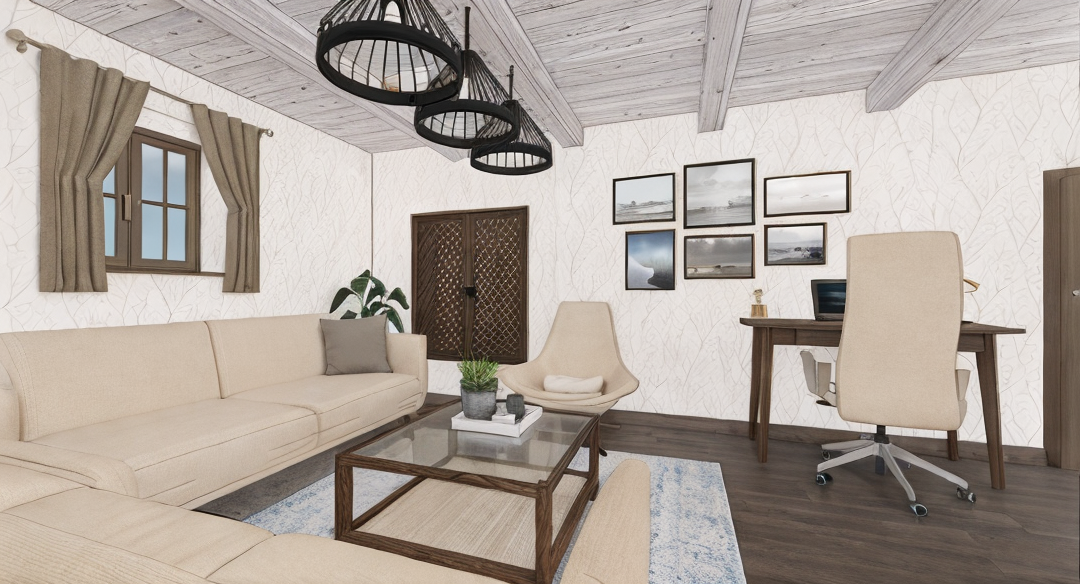 render this image in a realistic style maintaining the exact same composition furnishings lightning and design without adding or removing elements the floor is gray ceramic like polished concrete