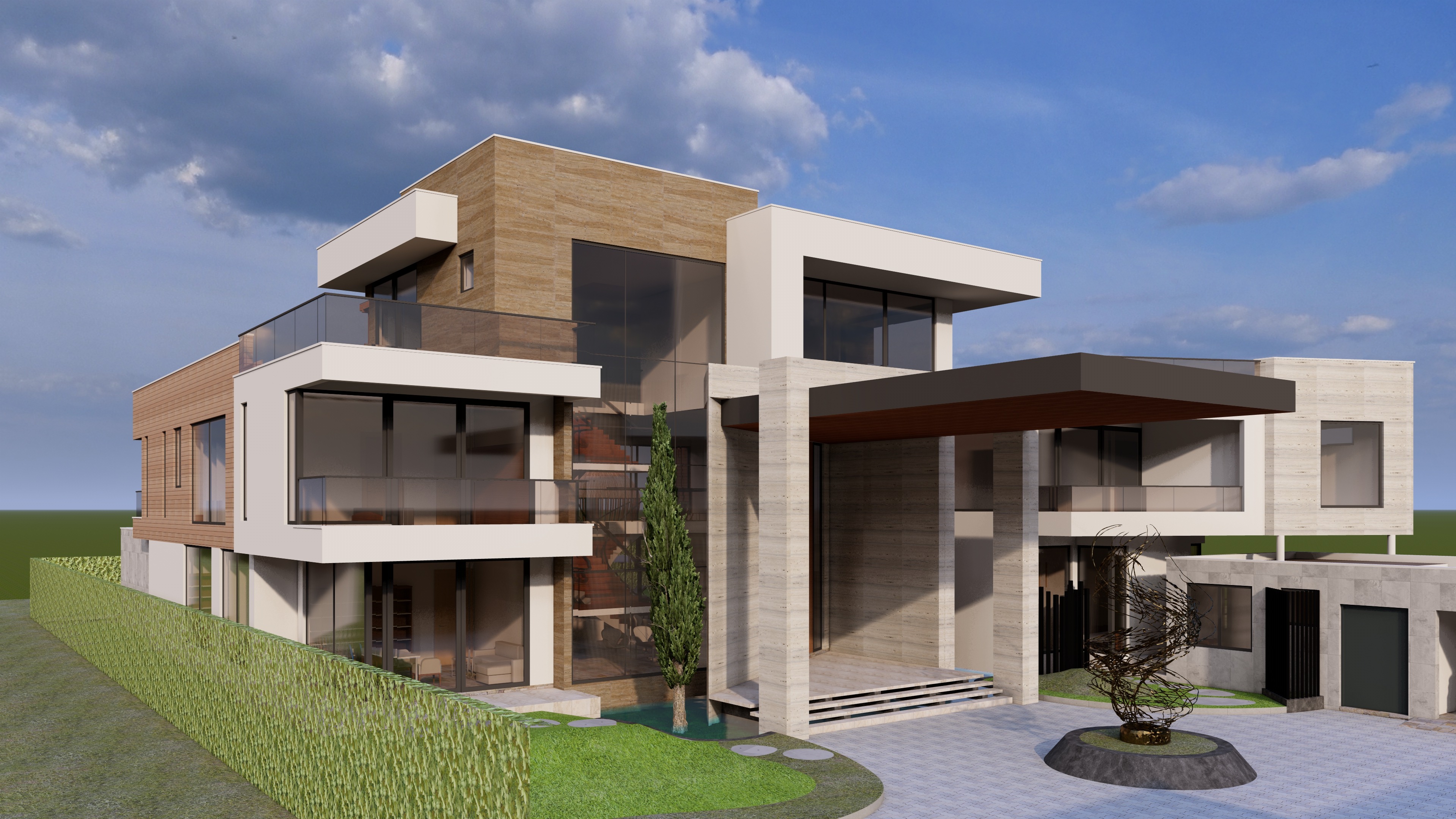 image of modern maisonette add few trees in far far background for context add very few vegetation including very very few floral ones for context as well make scene look lived in there should not be any haziness or excess strength from the sun light or sun rays