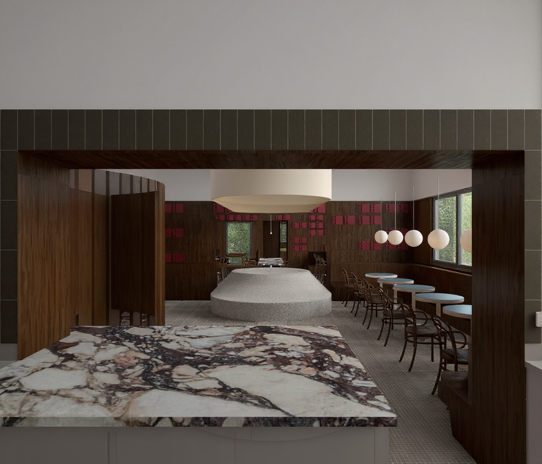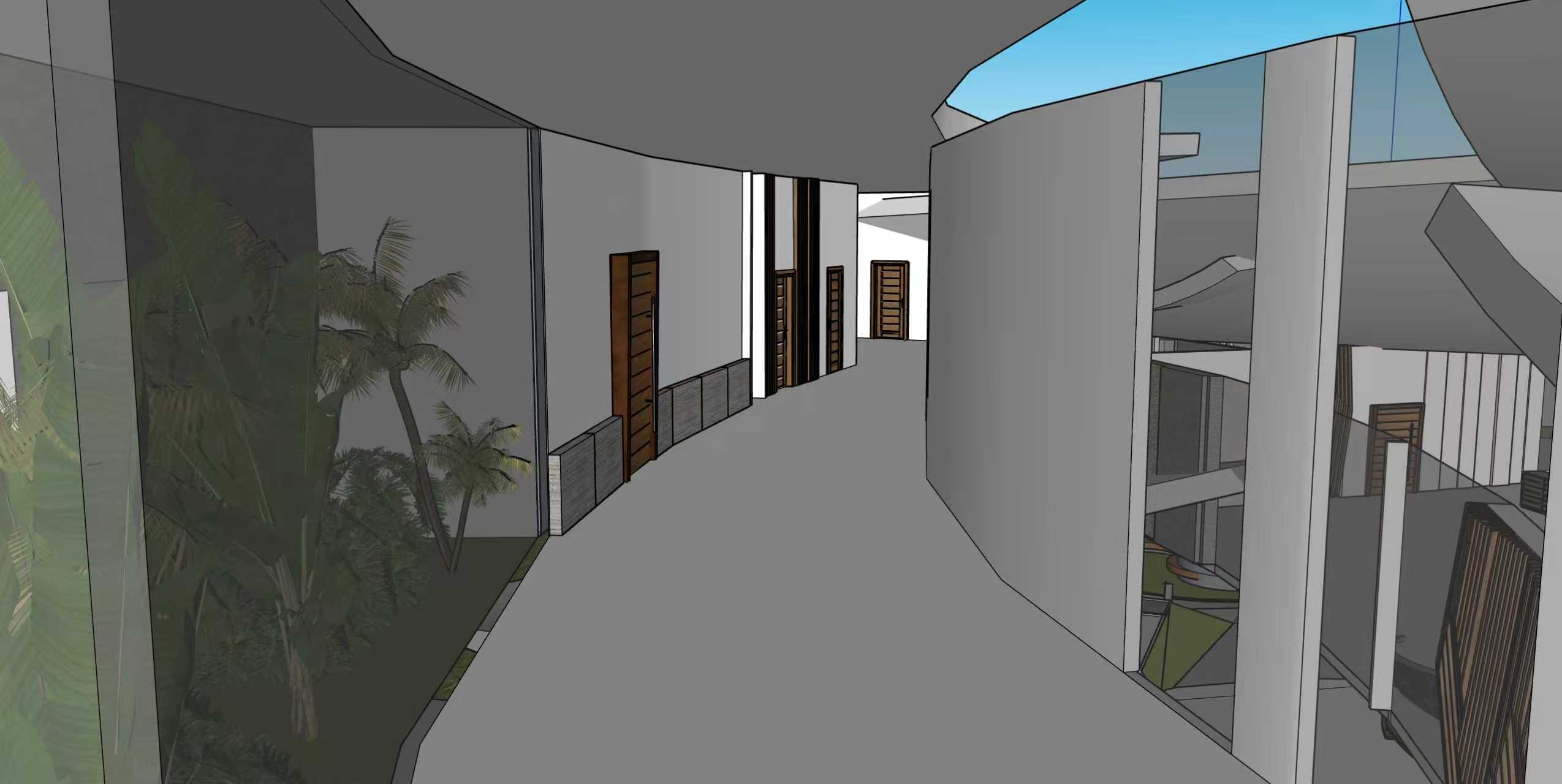 modernist interior shot use nature material wood stone concrete coziness and greenery set in the evening with soft gentle sunlight make it a community center make roofs curvy architecture