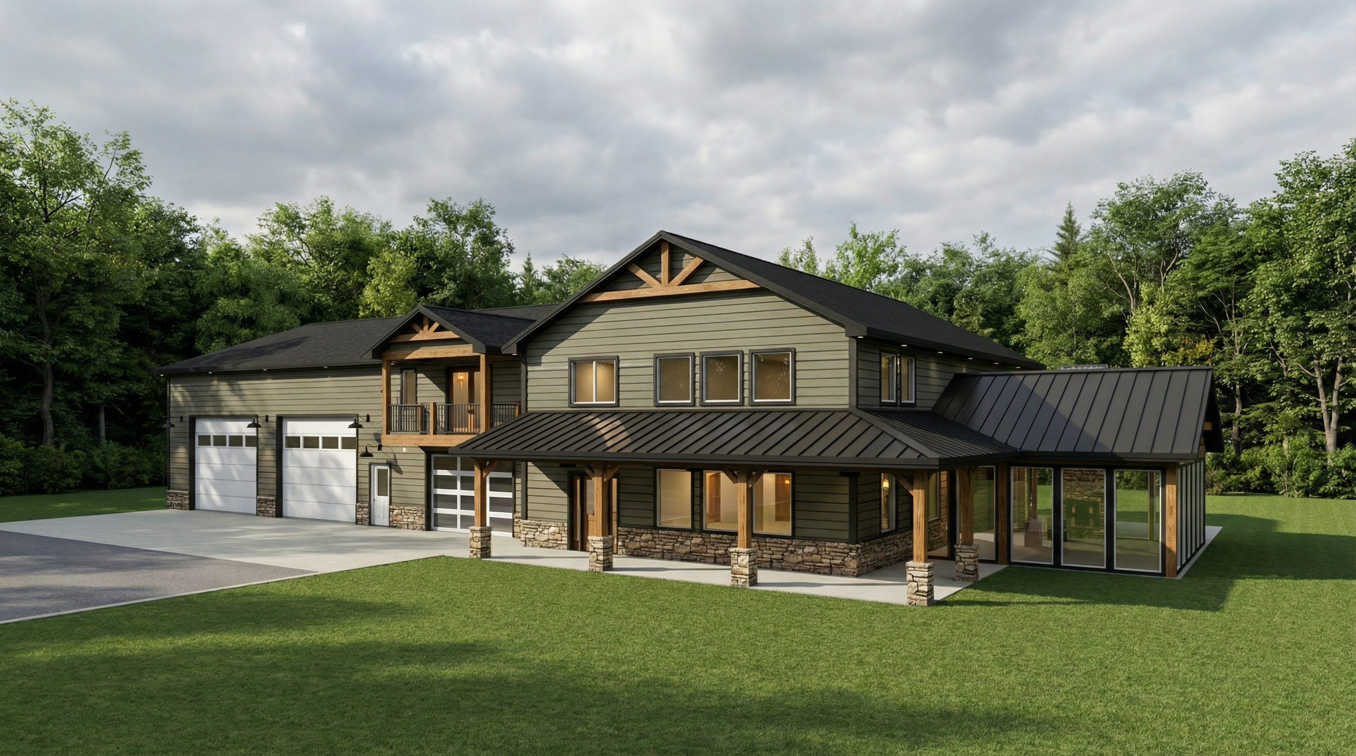 black roof black garage doors black windows black front door off white fascia and soffit off white siding clear stained cedar columns off white gutters and and down spouts add ski nautique in driveway