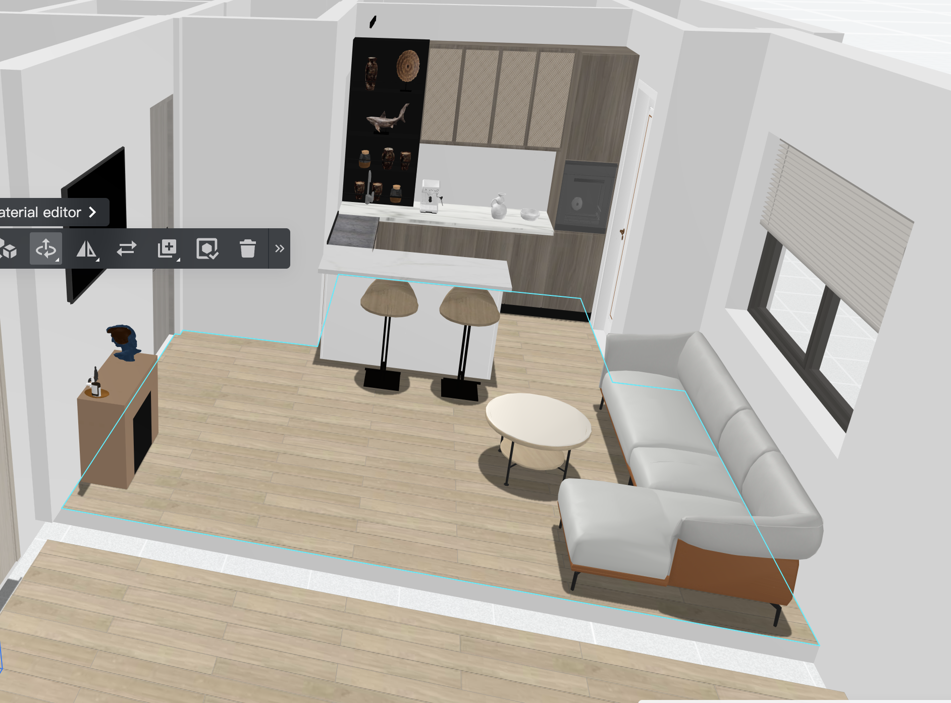 a midcentury modern minimalist living room in a monochromatic and earthy palette featuring a sleek black tv mounted on a crisp white wall the cozy sofa is upholstered in a soft light beige fabric inviting comfort and warmth the room is seamlessly connected to a kitchen area with a white breakfast bar and elegantly contoured wooden stools with sleek black legs the light oak wood floor adds a natural touch natural light streams through casting gentle shadows creating an airy serene atmosphere a modern sculptural decor piece in deep mint and olive green sits gracefully on a small light wood pedestal subtly drawing attention