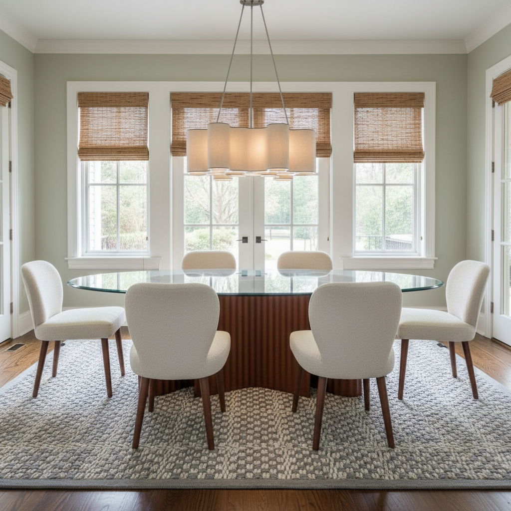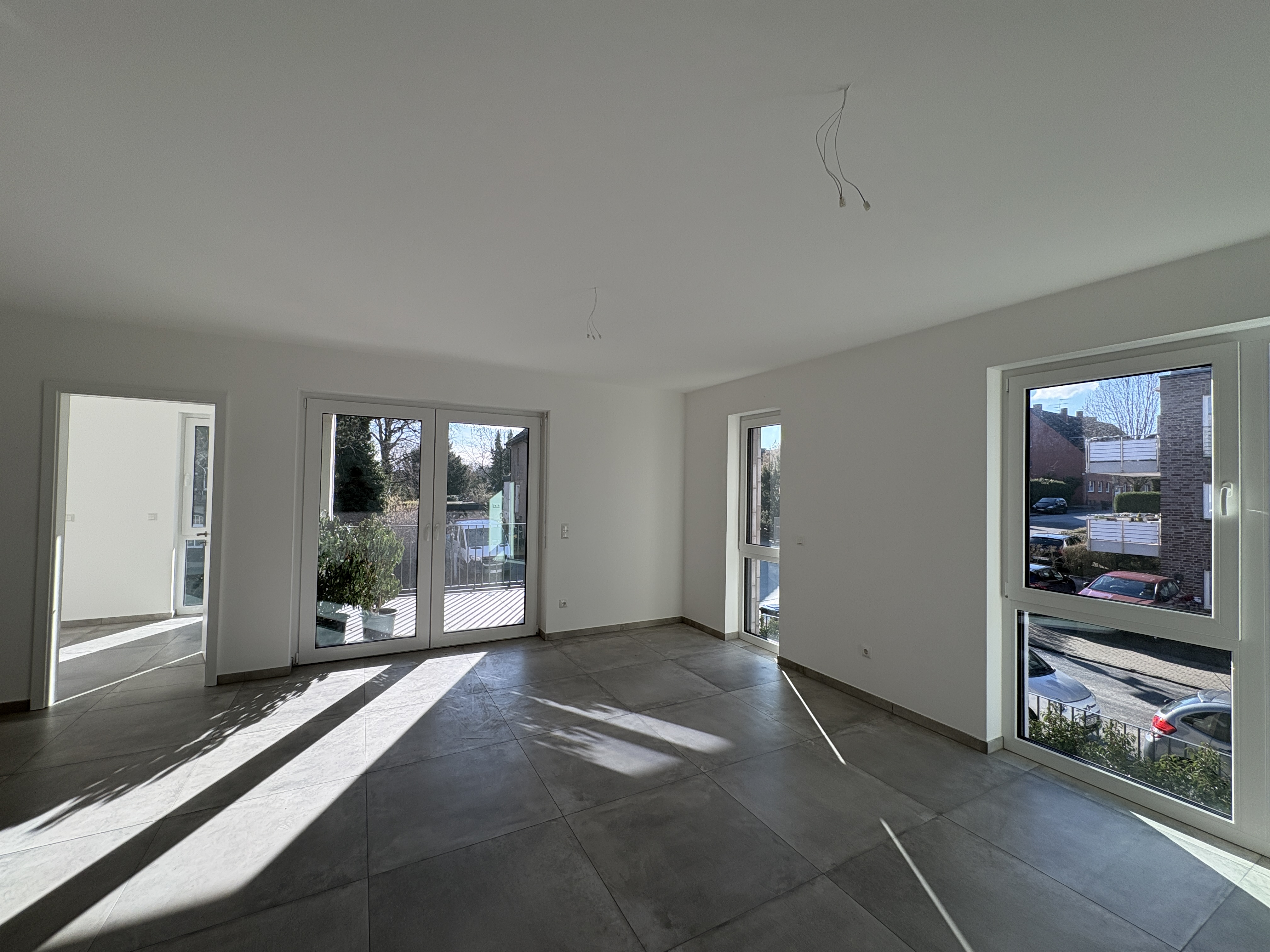 a modern minimalist living room design darker oak flooring complements a light wood grained media console and a cabinet with matte black handles a sleek glass coffee table with elegant brass fittings completes the design the atmosphere is calm and relaxing accented by lush green plants hanging in black pots the lighting is soft and natural creating a relaxing spa like atmosphere the mirror is backlit the shelving alcove with four shelves is illuminated from top to bottom by an led strip the fixtures are brushed copper the mirror reflects the smooth frameless white door