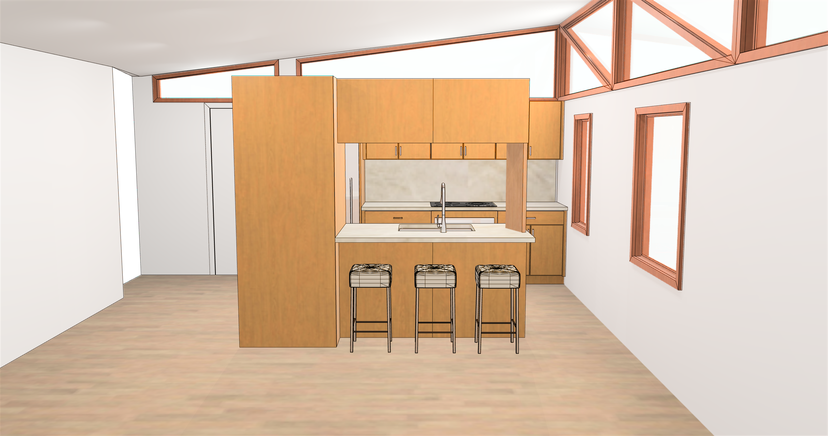 ultra realistic contemporary kitchen interior photorealistic architectural visualization soft natural daylight from large windows accurate global illumination and soft shadows window trim to match the cabinet color custom soft caramel maple wood cabinetry warm undertones subtle natural grain satin finish modern flat panel doors with minimal hardware taj mahal quartzite countertops and backsplash with creamy beige base soft taupe and light gray veining polished stone surface with realistic light reflection and depth balanced warm color palette realistic textures and material depth true to life scale sharp focus high dynamic range professional interior photography style 8k architectural render ultra detailed natural and inviting atmosphere