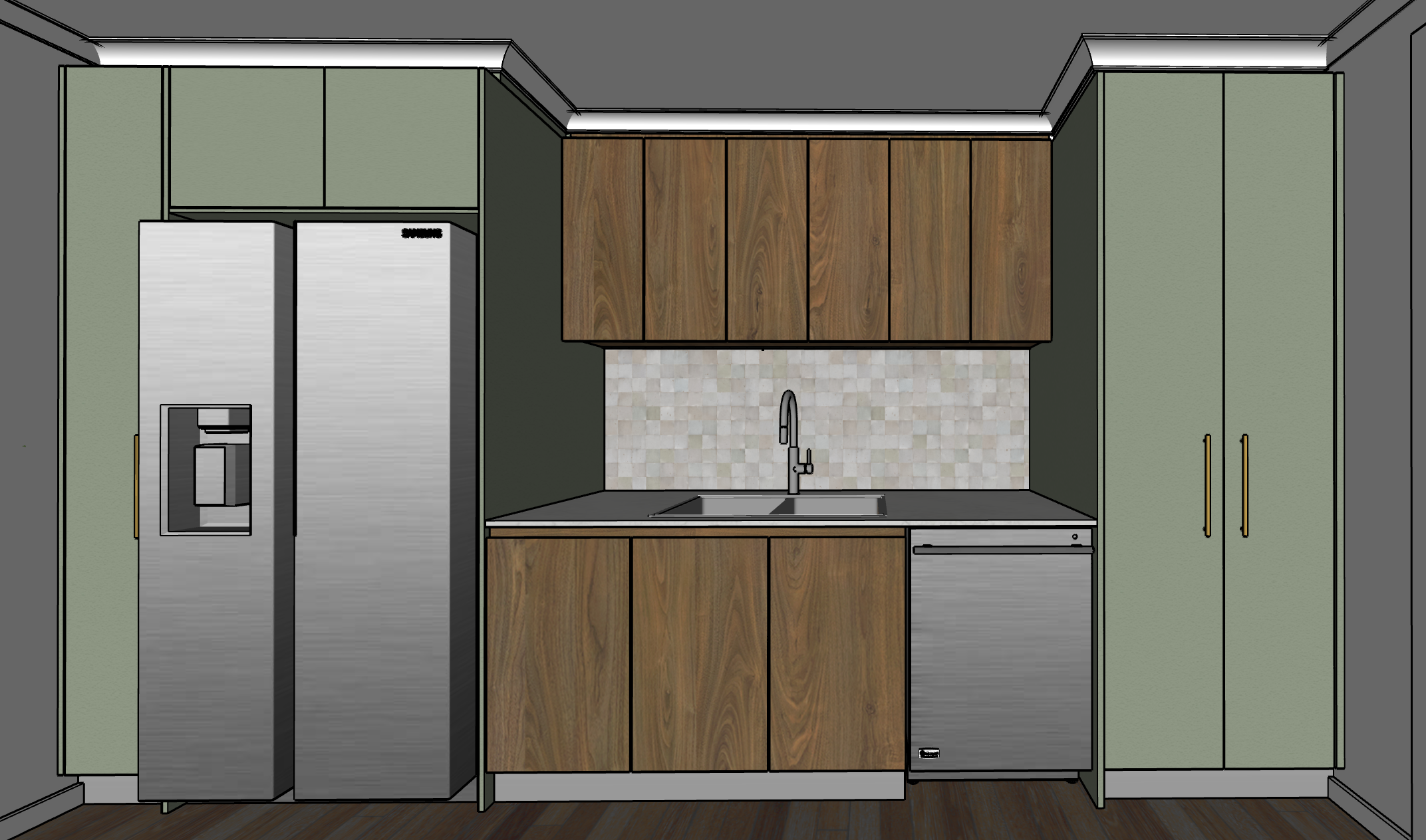 render highest quality textures and photorealism kickboards below cabinets to be brushed stainless steel finish 55mm cornice painted white to match ceiling bulkheads above cabinets to match cabinet colour afternoon sun coming into kitchen