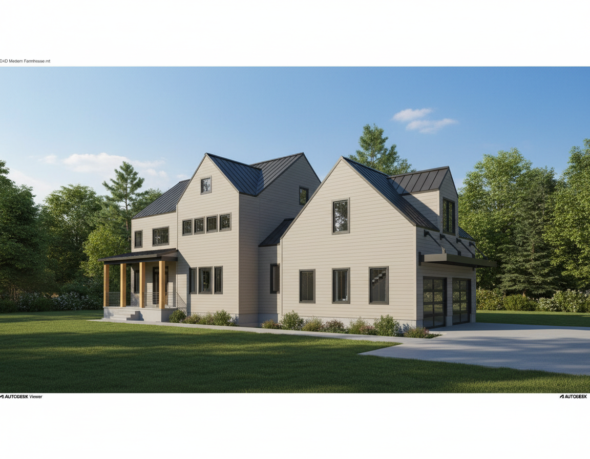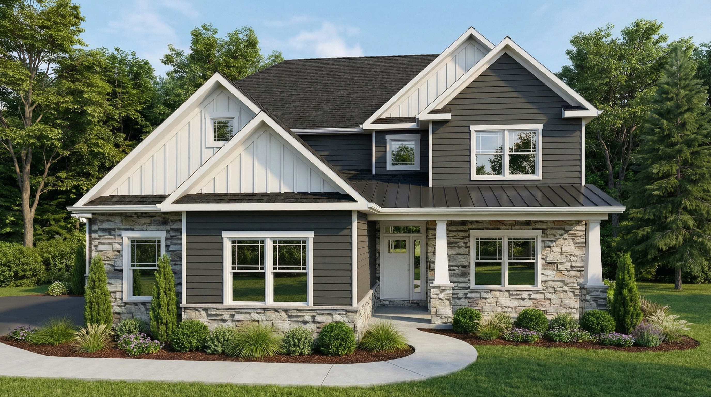a charming modern house with a minimalist design the exterior features smooth beige lap siding walls complemented by a sleek dark gray slate metal gabled roof windows are framed in a black tone bringing contrast and sophistication surrounding this structure a serene environment bathed in soft natural light under a clear bright blue sky the atmosphere is peaceful and inviting evoking a sense of tranquility provide trees in the background