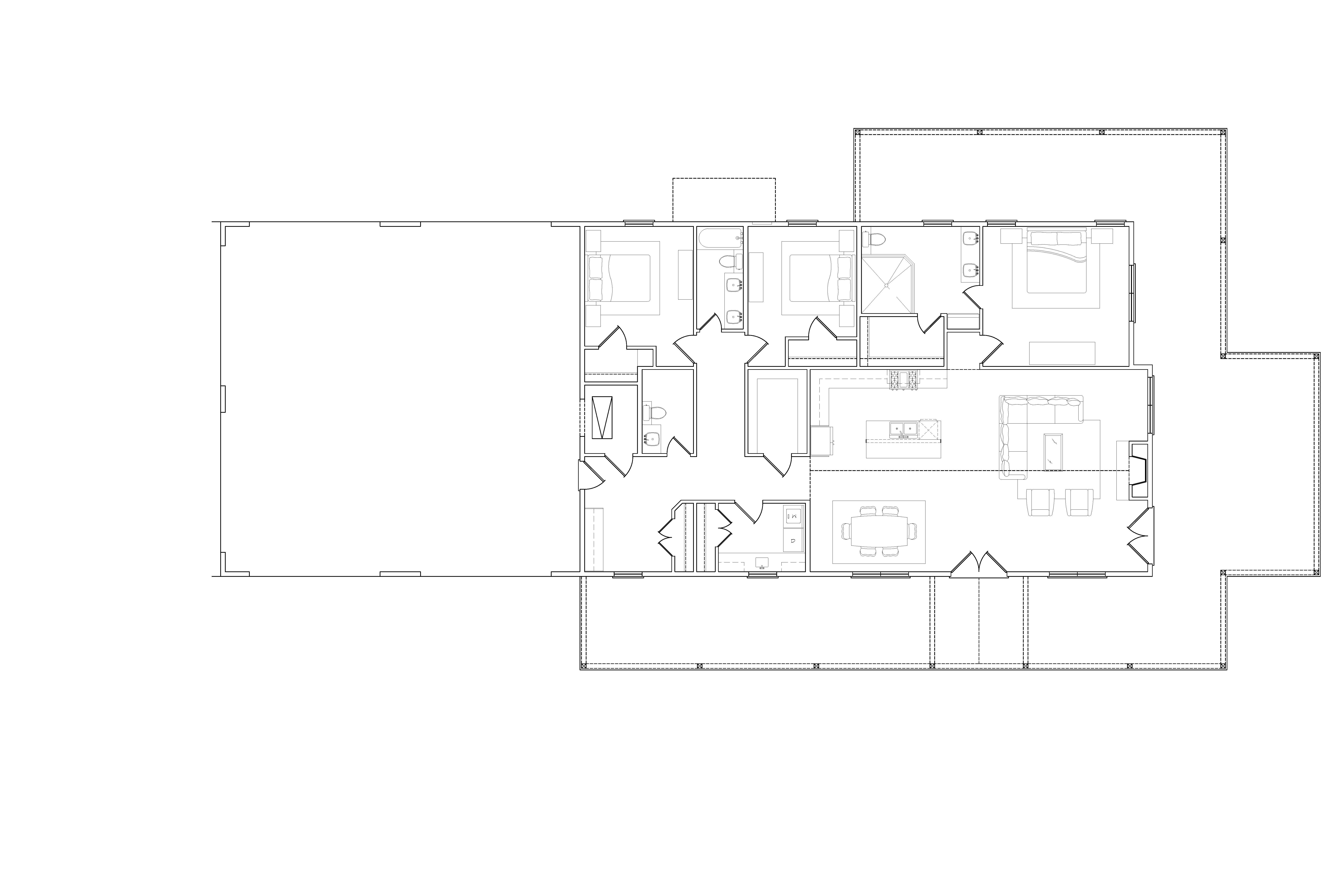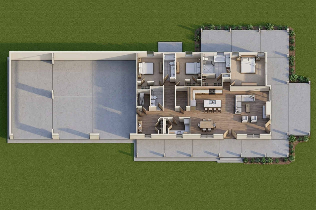 convert this floor plan into a architectural isometric 3d view of a full house show the space from an elevated angle with furniture walls and details visible porches are all concrete this is a slab on grade barndominium use the same furniture as shows on the plan do not change the orientation of the floorplan