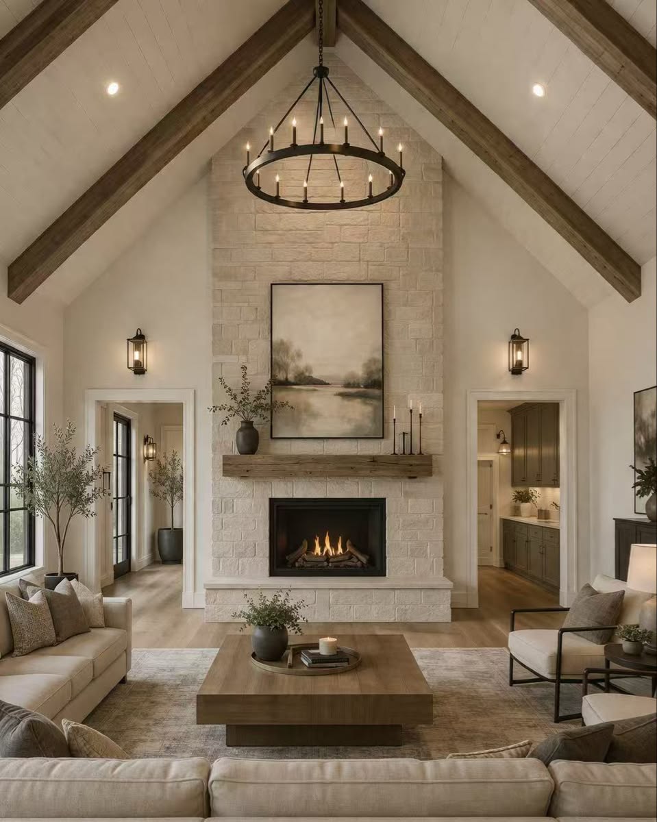 change the doorways on either side of fireplace to built in cabinets and floating shelves no shiplap on ceiling