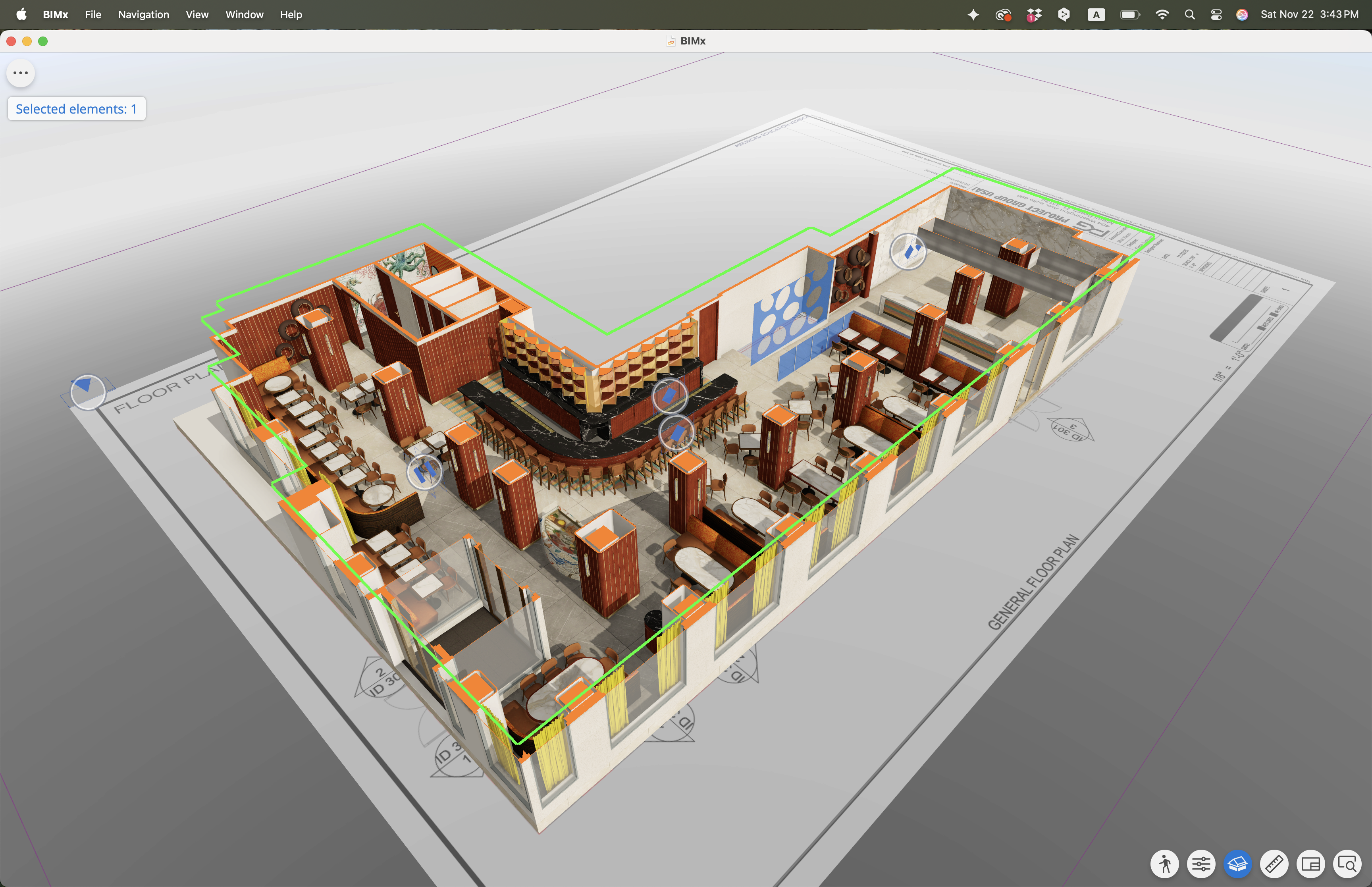 high resolution axonometric rendering of a full restaurant interior model shown as a standalone object maintain the same geometry proportions layout and furniture arrangement as in the reference model the building is displayed without a roof revealing the full interior curved central bar with amber backlit shelves seating zones columns restrooms wall art mosaic seafood counter the model sits on a white presentation base with a technical floor plan sheet underneath including linework title block scale marks and architectural annotations lighting is soft and realistic with natural shadows materials should appear realistic dark walnut wood panels marble countertops amber glass tan upholstery mosaic floor accents textured walls clean studio background no environment no sky crisp edges professional architectural presentation style like a physical scale model photographed in a studio ultra sharp high detail no distortion