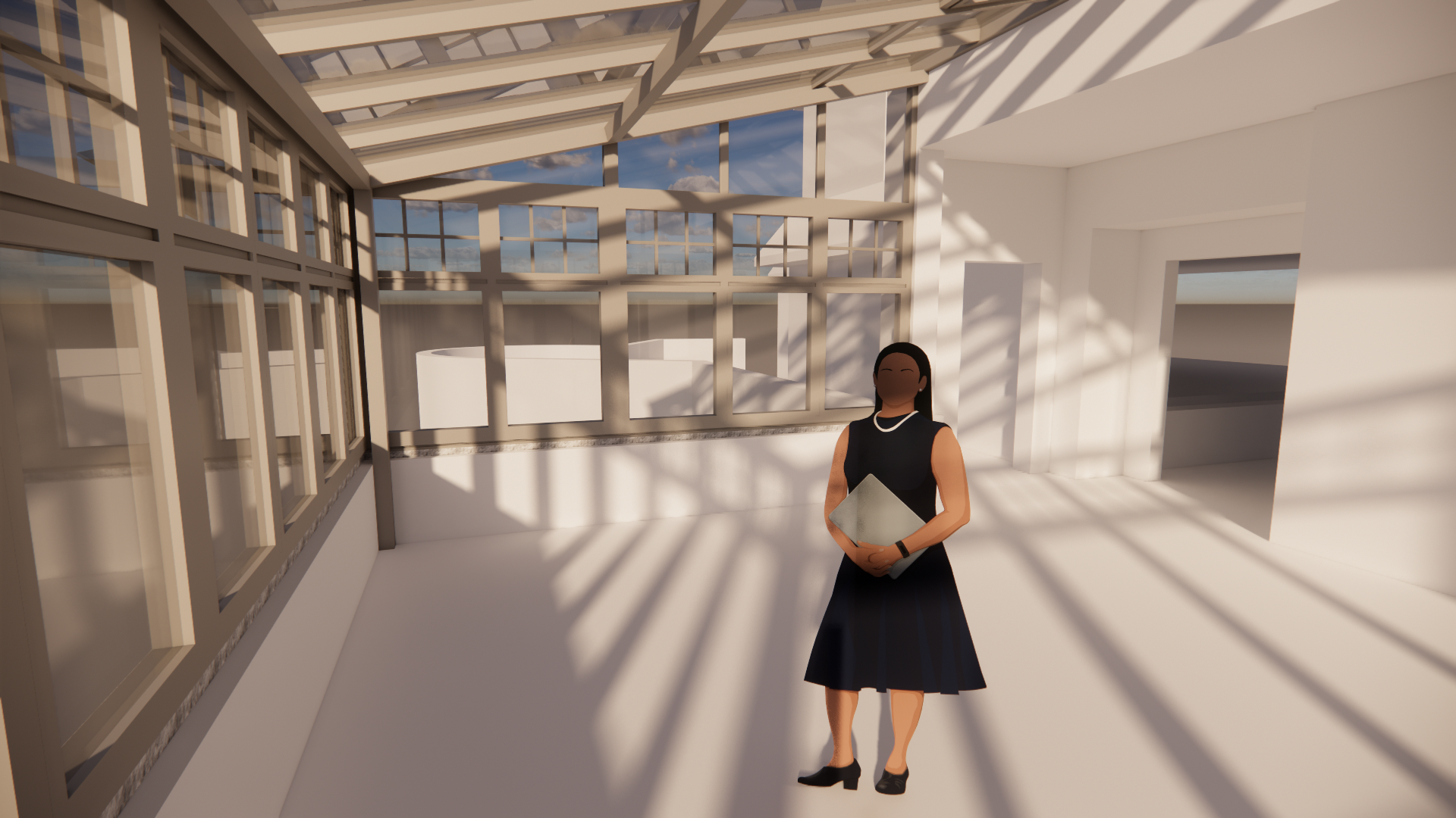 a woman stands in a modern sunlit conservatory with large windows the warm sunlight casts intricate shadows on the white walls and floor creating a serene and peaceful atmosphere the walls and ceilings are a soft pure white enhancing the brightness of the space the sky outside is a vibrant blue with wispy clouds visible through the clear windowpanes the woman s dress is a deep navy blue contrasting with her pearl necklace and black shoes she holds a pale gray folder in a professional confident manner the overall mood is calm elegant and sophisticated cozy living room furniture in conservatory