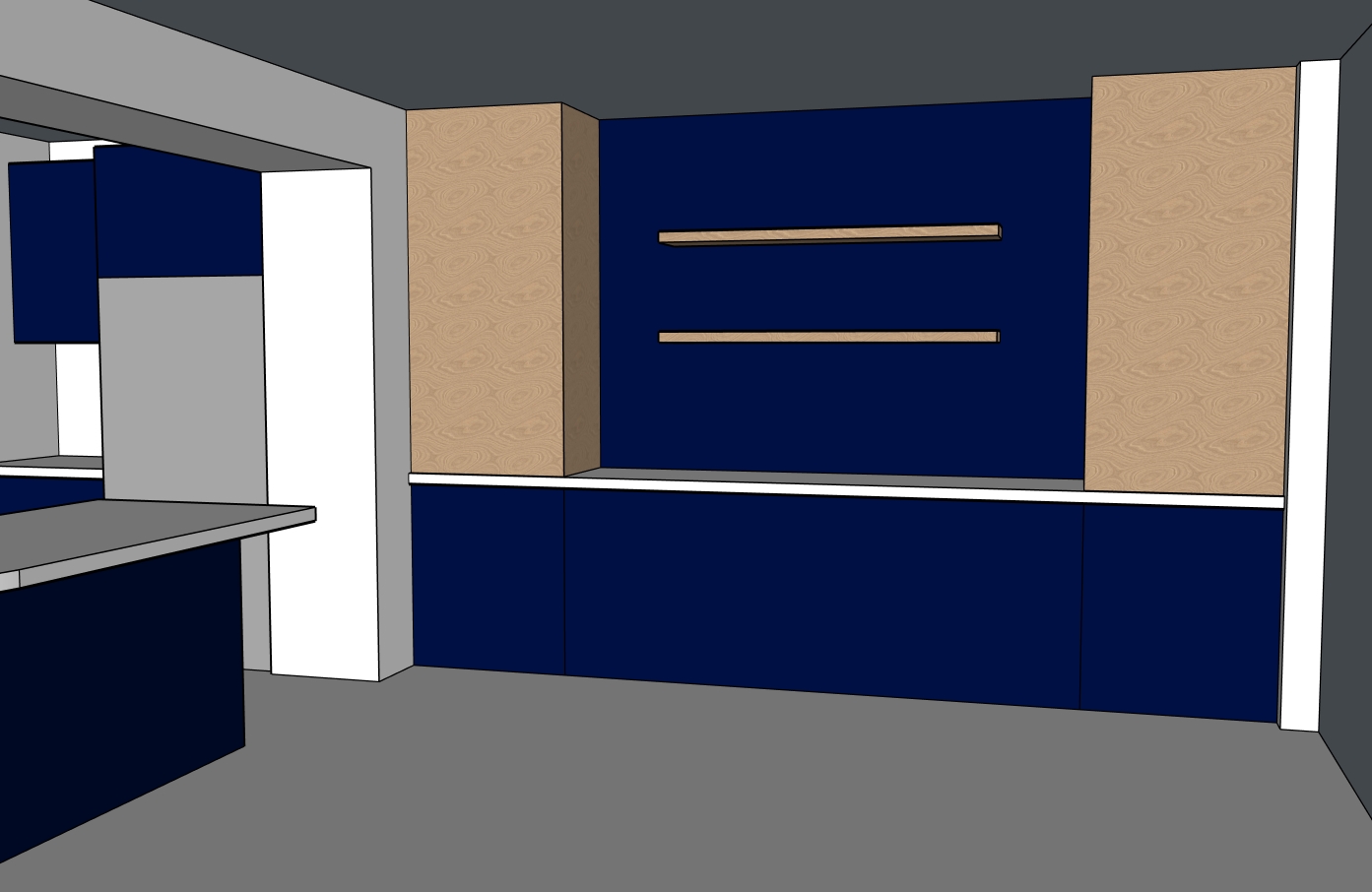 the only appliance in this view is the fridge off to the far left the fridge is stainless steel the blue should be cabinets that are a dark blue stained maple the door town is a light maple the counter tops are carrera marble