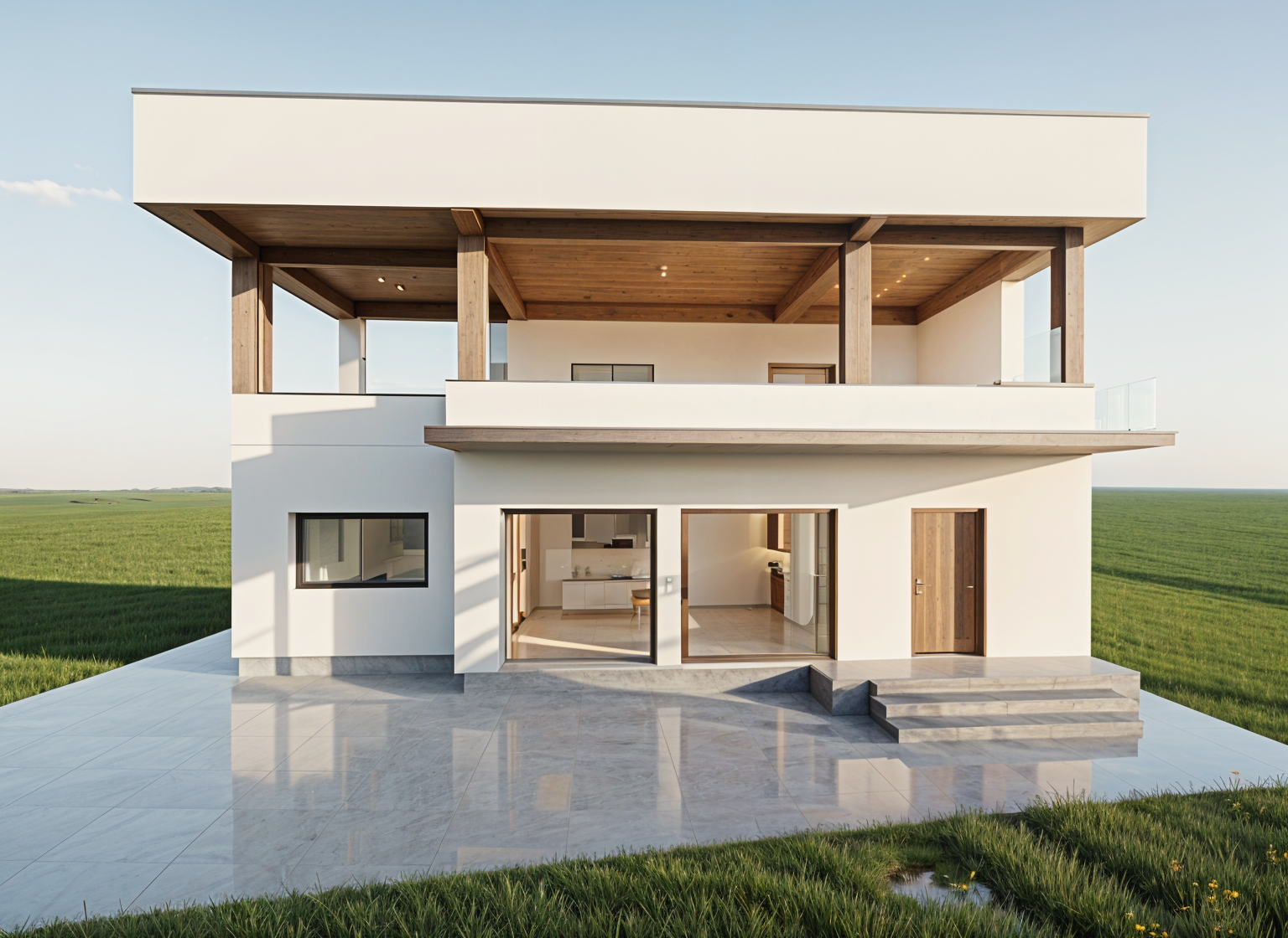 a peaceful suburban neighborhood scene during the early morning with a clear blue sky and soft sunlight casting gentle shadows residential houses with modern design featuring gray and white exteriors and dark roofs lush green lawns and vibrant flower beds line the concrete sidewalk trees with bright green leaves dot the street providing a serene and tranquil atmosphere a few relaxed people walking casually dressed in light comfortable clothing evoke a sense of community and quiet suburban life soft natural lighting enhances the inviting and harmonious ambiance of this picturesque street