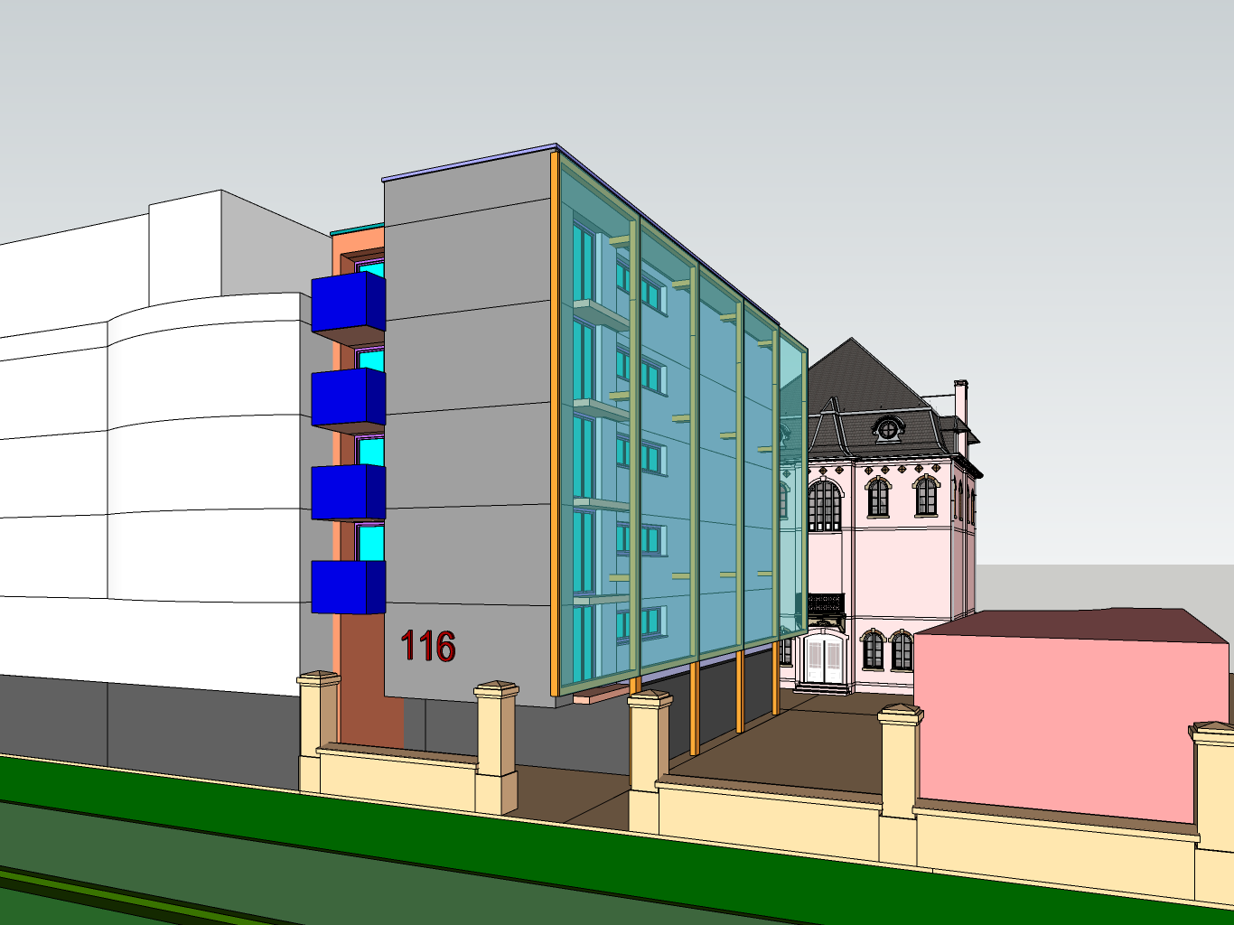 contemporary architectural project in roubaix france based on a simple sketchup model maintain the exact perspective proportions and composition foreground a street with sidewalk and a low brick enclosure wall with pillars clean urban environment main building contemporary volume with prefabricated light grey concrete fa ade on the left blue lacquered metal balconies important along the main fa ade a large transparent glass skin detached from the building this is a single continuous glass layer a second skin slightly offset from the fa ade it is not enclosed winter gardens it must remain visually thin elegant and continuous creating reflections and acting as a noise buffer glass appearance slightly blue reflective glazing subtle reflections of sky and surroundings very light transparency clean vertical framing background an existing late 19th century building in red brick with classical details fully visible behind the contemporary extension lighting soft daylight clear blue sky realistic shadows atmosphere calm refined contemporary architecture integrated into historical context high end architectural visualization realistic materials sharp details no extra elements respect original design strictly