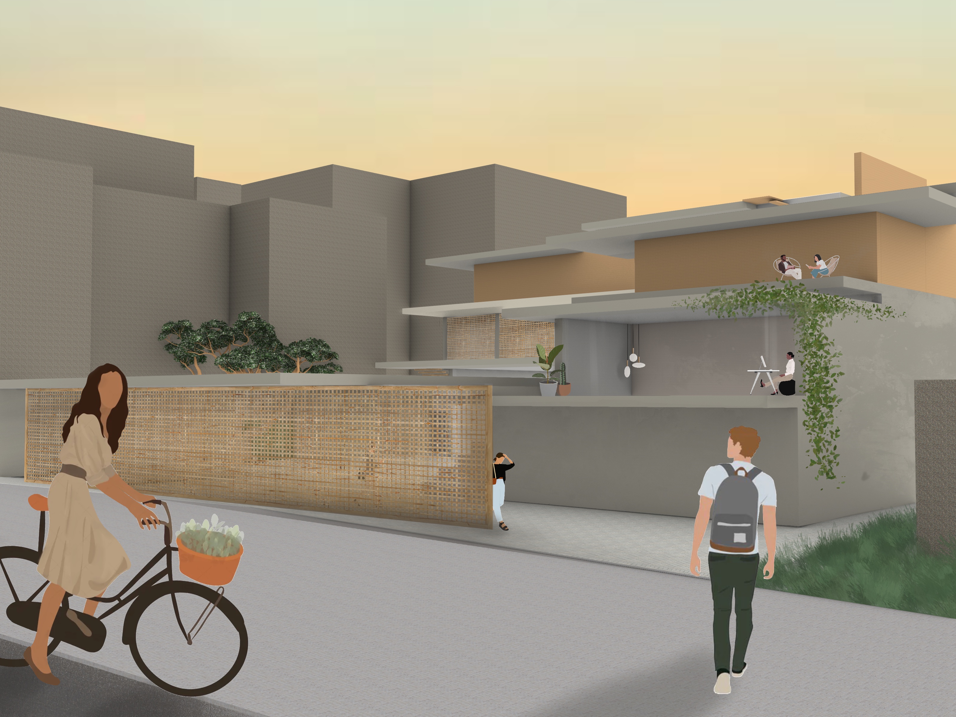 mediterranean revival exterior shot a modern urban scene with a gentle sunset glow the sky transitions from soft pastel yellows to light greens a contemporary building with a textured beige facade and minimalist balconies adorned with green hanging plants large neutral gray walls create a backdrop with small lush trees adding greenery in the foreground a woman rides a black bicycle with a basket filled with white flowers she wears a light beige dress a man in a white shirt and dark green pants walks past carrying a gray backpack the street is paved with smooth light gray concrete creating a clean and open atmosphere architecture