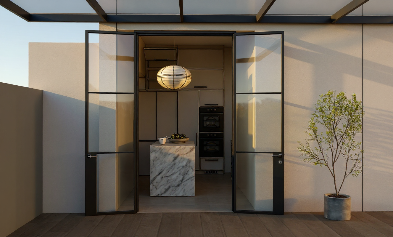 lights turned on glass roof morning spotlight on ceiling inside kitchen