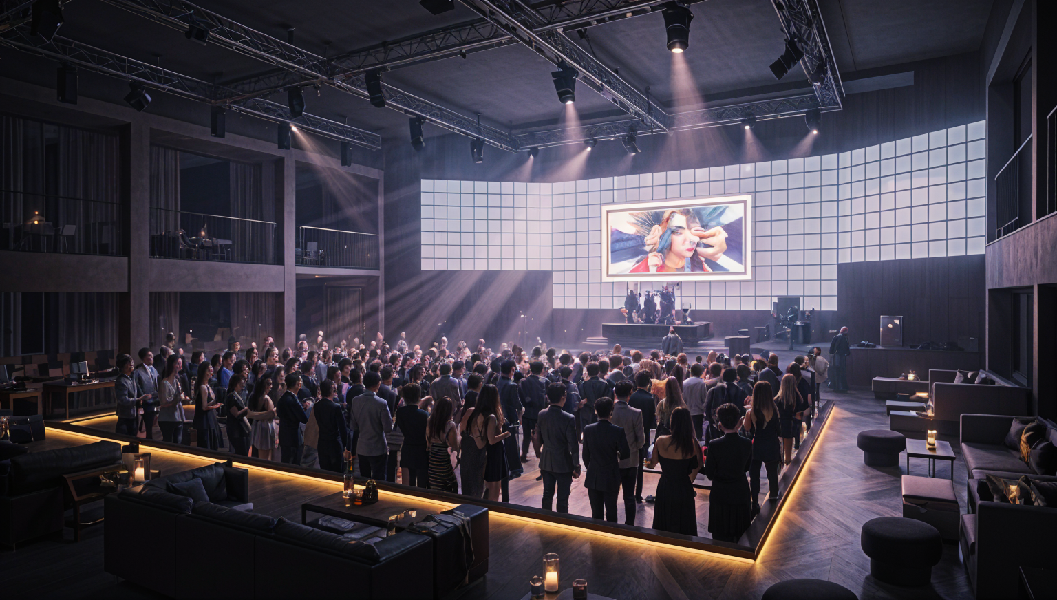 kengo kuma night shot designed by zaha hadid interior shot perspecctive is from the from row stage right use an excited full audience new urbanism perspective shot keep the exact camera angle distance and perspective from the supplied image do not move the camera or change focal length convert this scene into a photoreal upscale nightclub at night preserve the architecture exposed steel trusses balcony railings ceiling height stage shape wood fascia rigging positions and the single led wall do not change the geometry the audience area in front of the stage is a sunken dance floor that sits lower than the surrounding level the perimeter walkways and lounge platforms around it are higher preserve this elevation change do not flatten the floor levels add dramatic stage lighting with visible beams and subtle haze originating from the existing fixtures on the truss the single led wall should be slightly dimmer than the stage lighting display one unified abstract motion background clean and consistent no collage no text no logos no photos add a rectangular picture in picture imag overlay inside the led wall content as if routed through a switcher the led wall is the only screen do not add any other displays add upscale lounge seating with premium materials like leather velvet brushed metal and dark wood around the higher perimeter areas increase patron density patrons should face the stage and pay attention to the performers use polished concrete flooring with soft reflections lighting is warm and architectural mood is modern exclusive energetic concert ready architecture architecture there are overhead light trusses above the stage it should be dimly lit wiht dramatic breams from mild haze architecture
