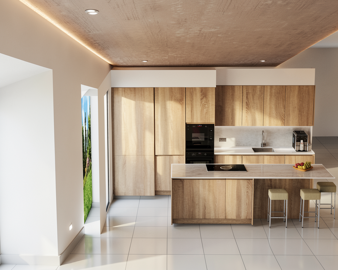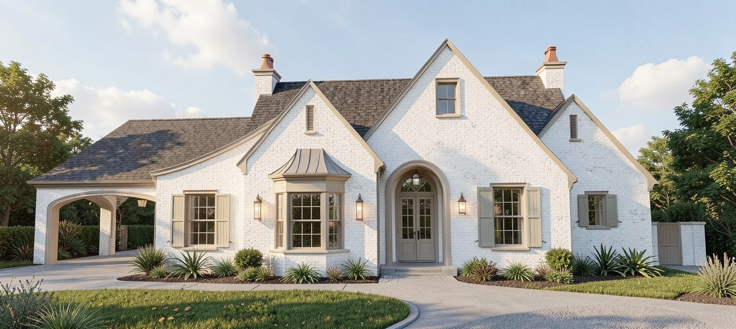 french country manor cream stucco with a light brown roof soft light white limestone black windows a light brown front door a manicured lawn with pine trees scattered behind mountains behind the trees native shrubs and flowers in the landscaping a soft blue sky with white clouds that soften the scene
