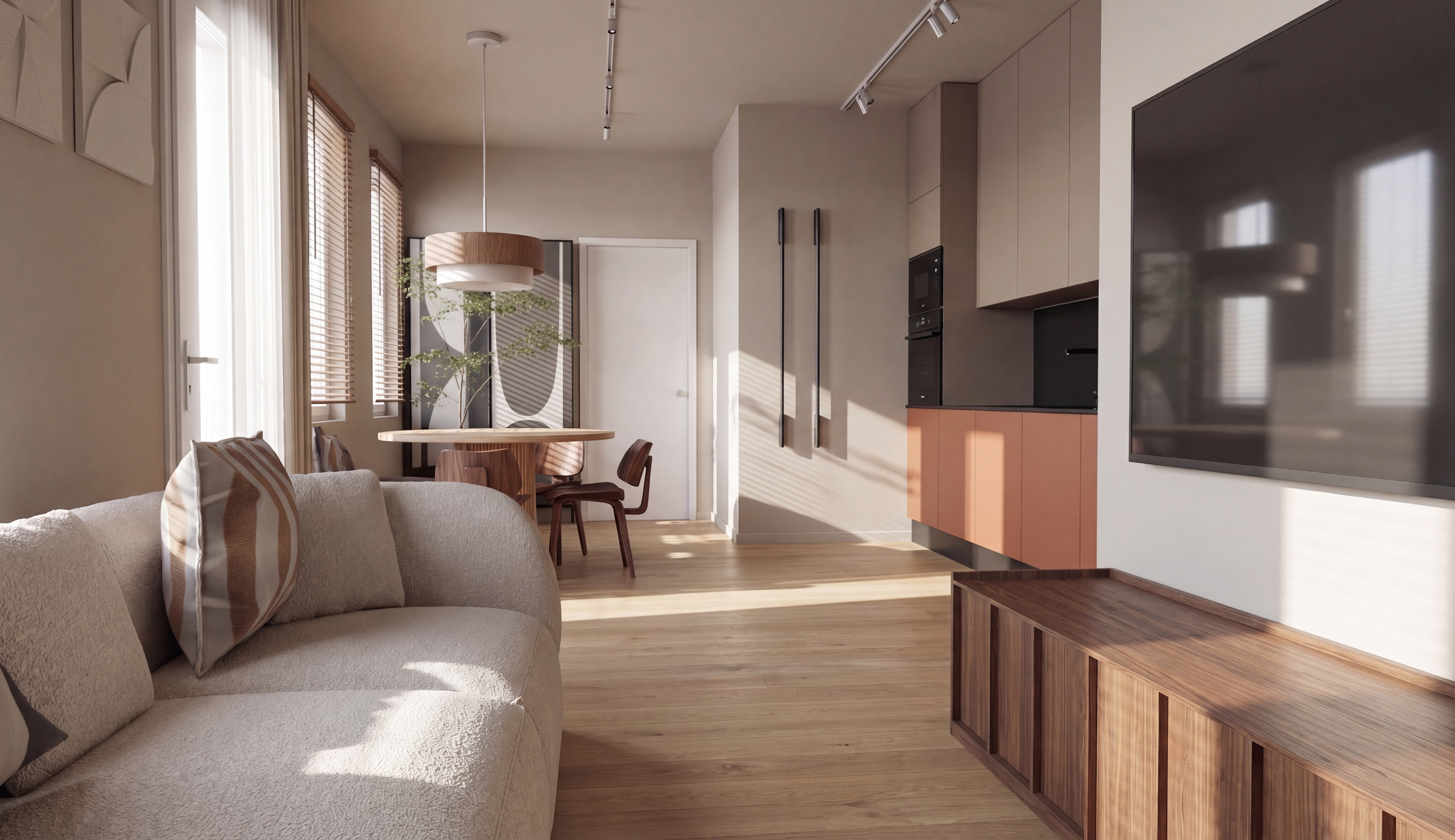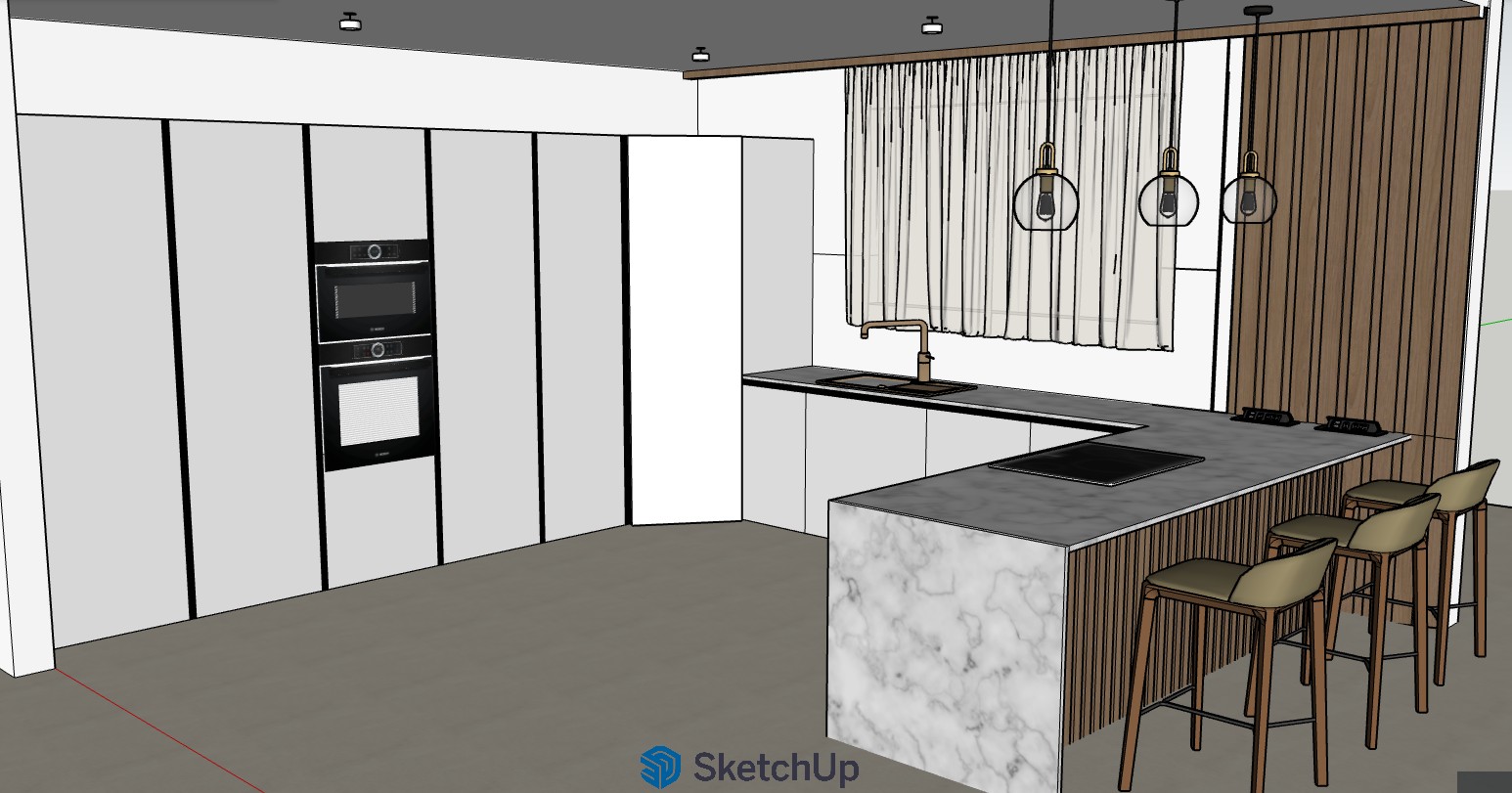 ultra realistic interior render of a modern japandi style kitchen based on the provided sketchup model maintain the exact layout and design kitchen cabinetry in light beige off white matte finish handleless and minimal kitchen island with waterfall edges in onyx beige marble including countertop backsplash marble should have soft warm veining with a refined natural look black kitchen fixtures faucet sink and appliances three pendant lights above the island with black frames and warm bulbs bar stools with wooden legs and light upholstered seats in neutral tones back wall window with sheer off white curtains allowing soft daylight lighting soft natural daylight warm ambient lighting realistic shadows and reflections materials matte cabinetry natural wood grain soft fabric curtains polished marble style minimal warm japandi calm and refined camera eye level slightly angled to show depth of the pantry corner clearly render quality ultra photorealistic high detail