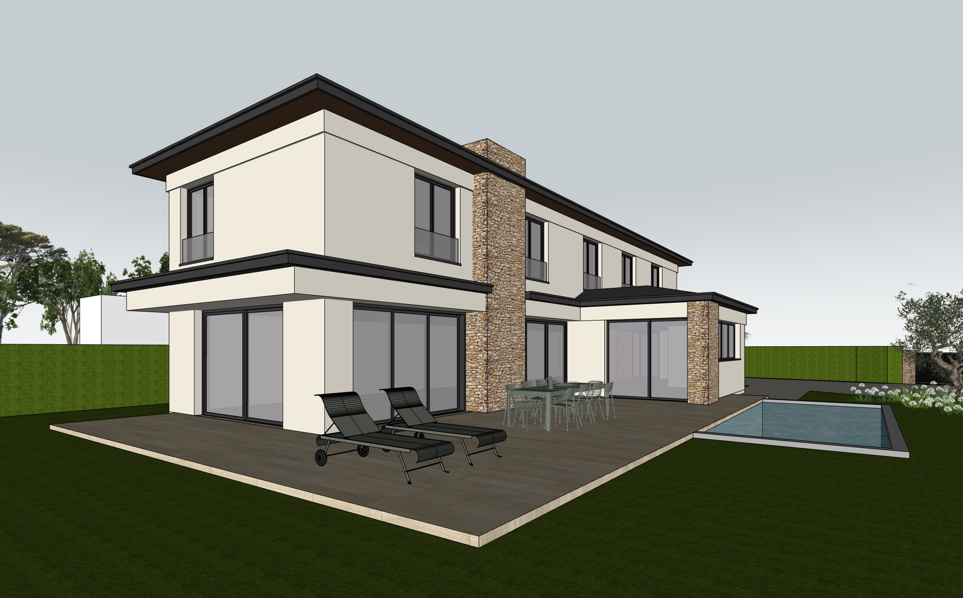 respect exactly architecture details and colors don t change details walls in white and black surfaces in dark grey make it charming terrasse in carrelage clear oack middle day light add furnitures
