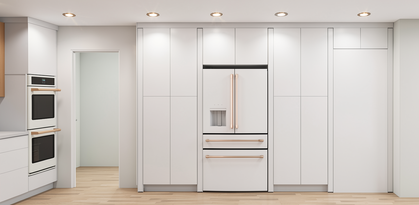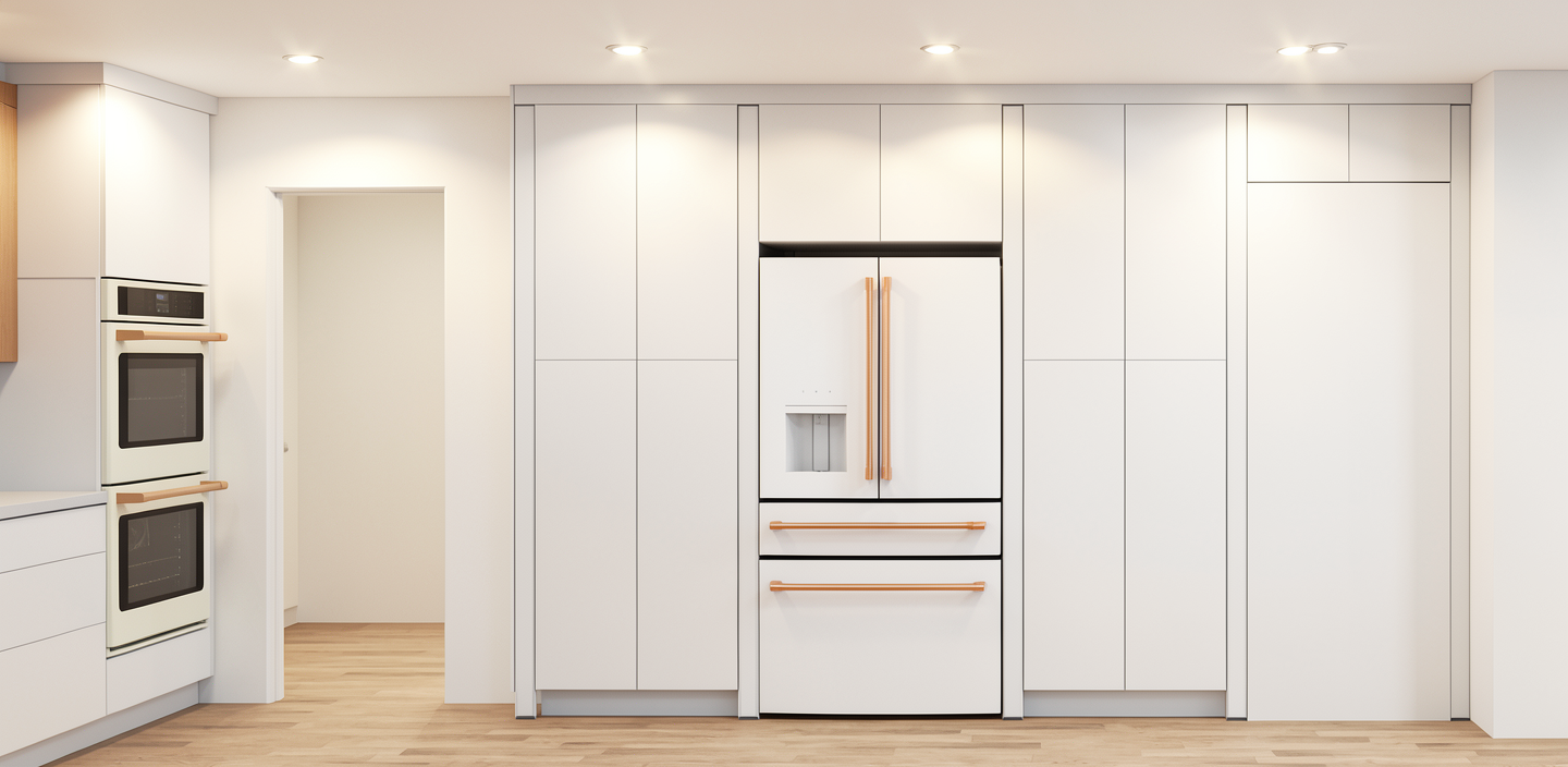 kitchen shaker style cabinets cabinets a finished in a soft cream and some are finished in a warm walnut stain the central island is topped with a smooth white marble countertop exhibiting subtle gray veining the walls and ceiling are painted in a soft white color the pendant lights above the island are elegant with frosted glass shades with brass accents the wooden floor is polished oak adding warmth and richness to the space with natural lighting