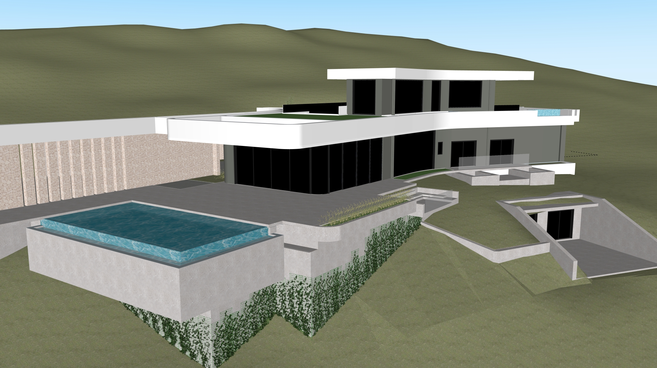 modernist exterior shot modern luxury hillside villa in tolo greece viewed from a lower eye level angle showing the entrance terraces and pool with the sea visible in the background the terrain is a smooth natural slope fully covered with green grass the landscape is continuous and natural without stepped terrain without terraces and without stone or gravel surfaces pool the swimming pool is fully embedded into the ground and integrated into the terrain no visible structural walls no exposed concrete base no infinity edge the terrain and grass continue naturally around and below the pool completely covering its base water is ultra realistic with reflections transparency soft ripples and natural light interaction architecture contemporary minimalist villa with curved and cantilevered slabs large glass fa ades warm interior lighting is on fully furnished interior visible through glass living room sofas dining table modern furniture landscape natural green lawn dominates the site a few mediterranean trees such as olive trees and cypress trees placed organically no gravel no rocks no dry landscape circulation minimal architectural steps only near the entrance clean and simple not forming terraces and not dominating the landscape view open sea view of tolo with calm blue water and horizon line visible lighting atmosphere golden hour sunset warm luxurious lighting cinematic sky soft shadows high end luxury villa atmosphere elegant and calm materials exposed concrete white plaster natural stone only on the building large glass panels style photorealistic ultra detailed architectural visualization real estate quality render global illumination architecture