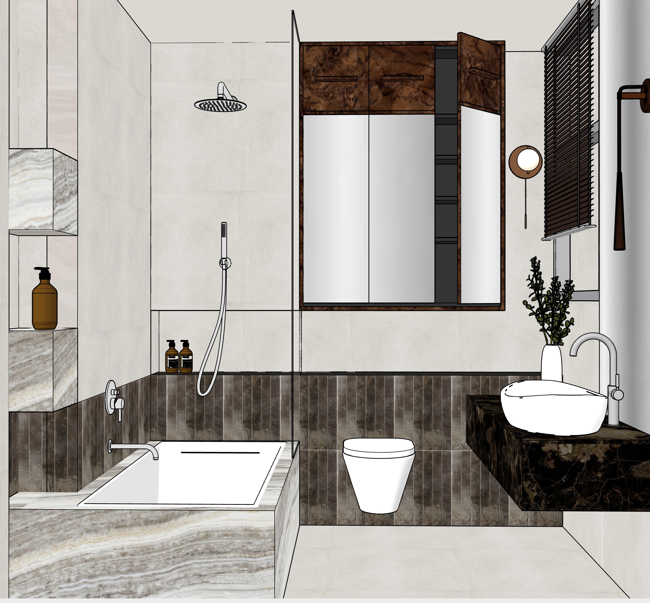 main toilet wall and floor tile is a greige concrete texture keep all materials full height mirror behind sink warm lighting ambient not too dark not to bright make sure vanity can be seen walnut burl add led under vanity only no other led lights to be added chrome taps and shower accessories long rectangular mirror in front of the sink countertop and shampoo niche ledges in dark emperador marble in the mirror reflection are a full slim glass block wall with door in the same wood tone as the mirror cabinet door stretches to the ceiling with the top 400mm being a fixed framed panel with clear glass door is solid laminate mirror cabinet in wood laminate and mirror doors follow design and don t alter the construction or design of the cabinet inside of cabinet to be a dark grey shade of laminate no led lights inside cabinet