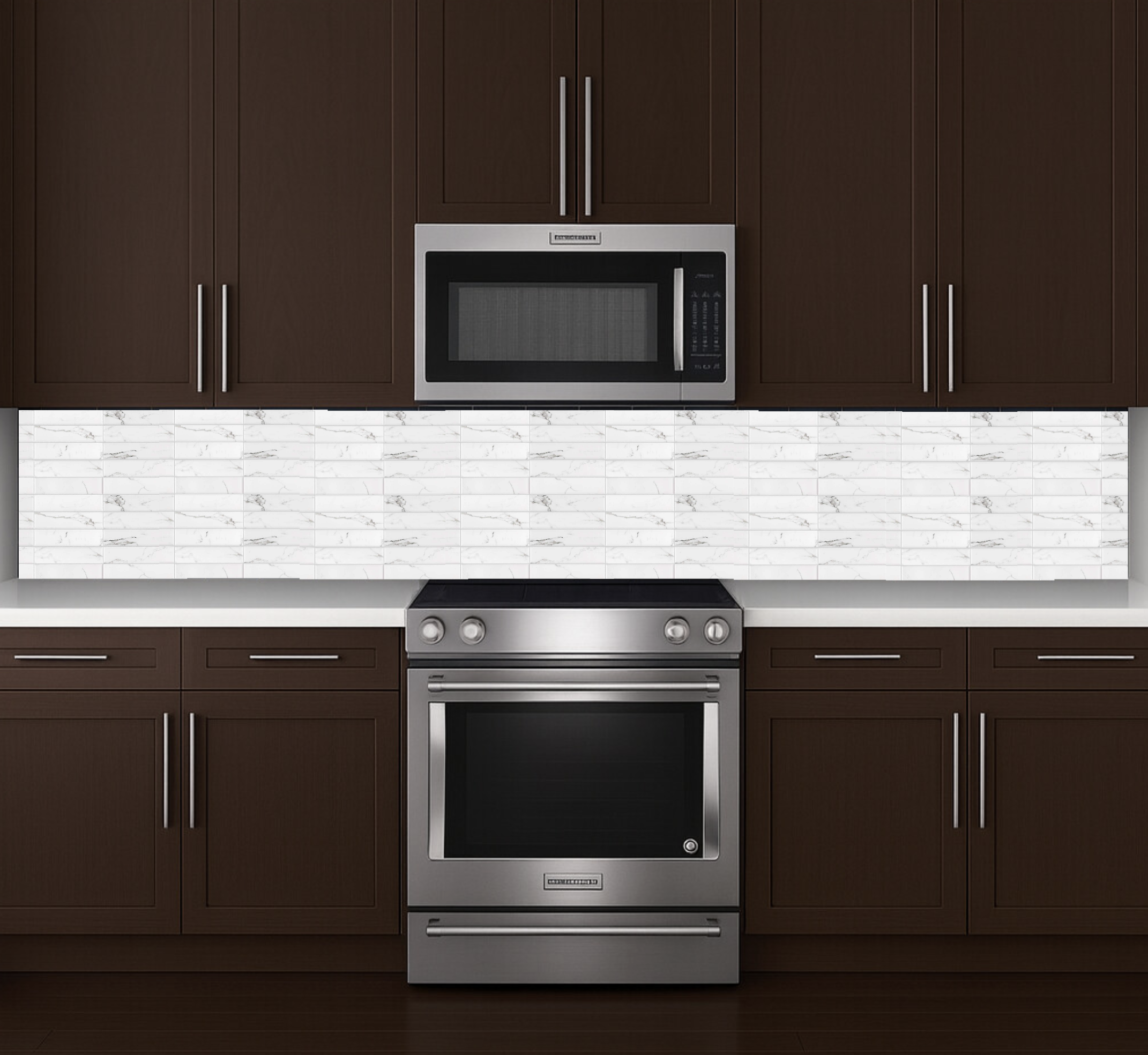 a kitchen with dark cabinets and nickle finishes and white backsplash architecture