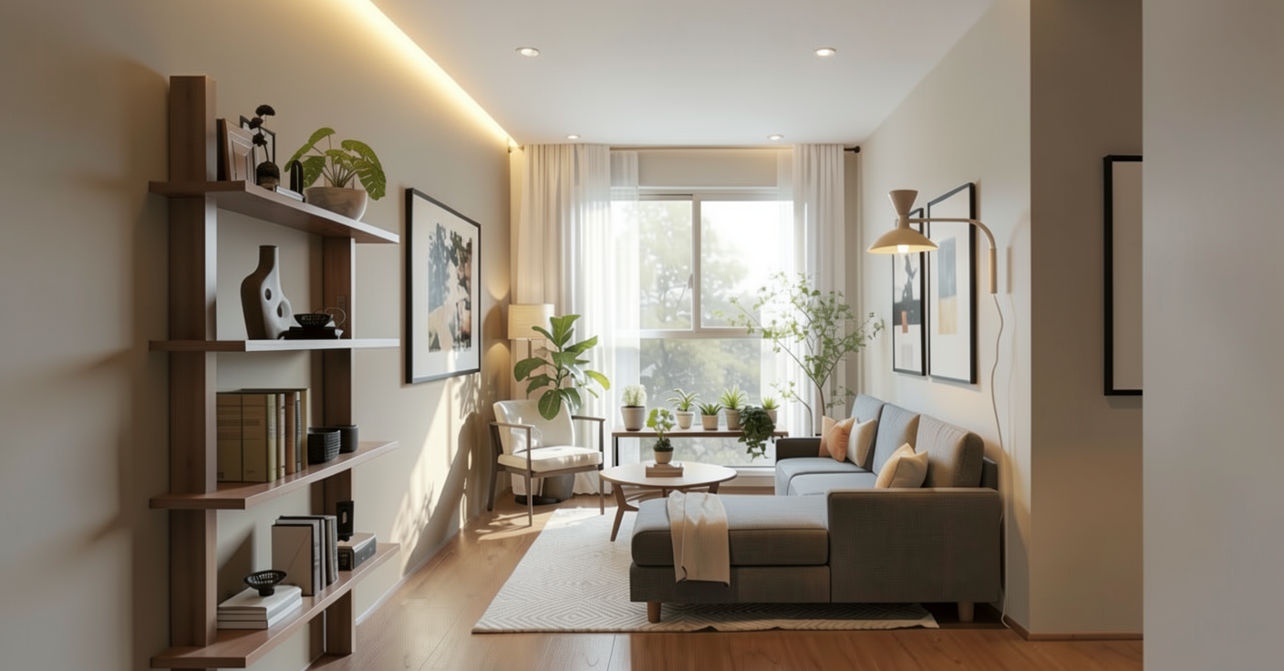 photorealistic interior rendering of a modern warm minimalist living room maintain the exact camera angle framing composition furniture layout materials textures and lighting exactly as in the reference image do not modify move add or remove any elements in the scene except for the specific adjustment described below remove the extra plant located behind the chair on the left side near the window this plant should be completely eliminated leaving the area clean and consistent with the surrounding space ensure the chair window curtains and all other nearby elements remain unchanged and properly integrated do not alter anything else in the image everything else must remain identical to the original reference
