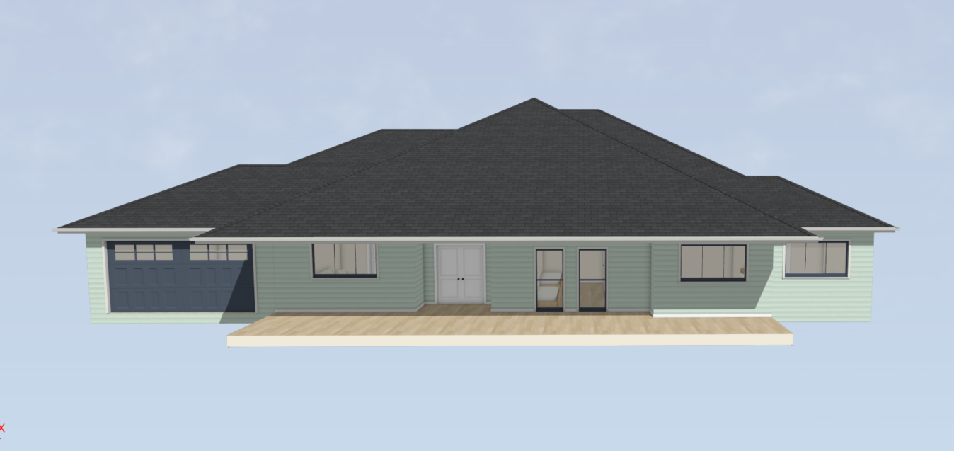 refine this existing single storey home by redesigning the roof and facade to reflect a modern barn inspired farmhouse with multiple layered gables keep the original building footprint layout and garage position unchanged do not add a second storey introduce a series of intersecting gable rooflines across the facade creating a balanced but varied composition include a dominant central gable over the main living area smaller secondary gables stepping out along the front a defined entry gable with exposed timber trusses for a strong focal point a slightly lower roofline over the garage so it reads as a separate volume apply a dark standing seam metal roof and matching black vertical cladding across the home for a cohesive modern barn look incorporate natural timber elements to the entry and verandah including posts and feature beams adding warmth and contrast add subtle material variation such as stone or a lighter base along the lower portion of the facade to ground the design set in a natural landscape with green grass soft daylight