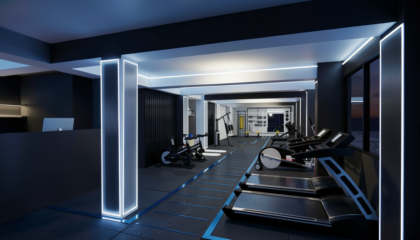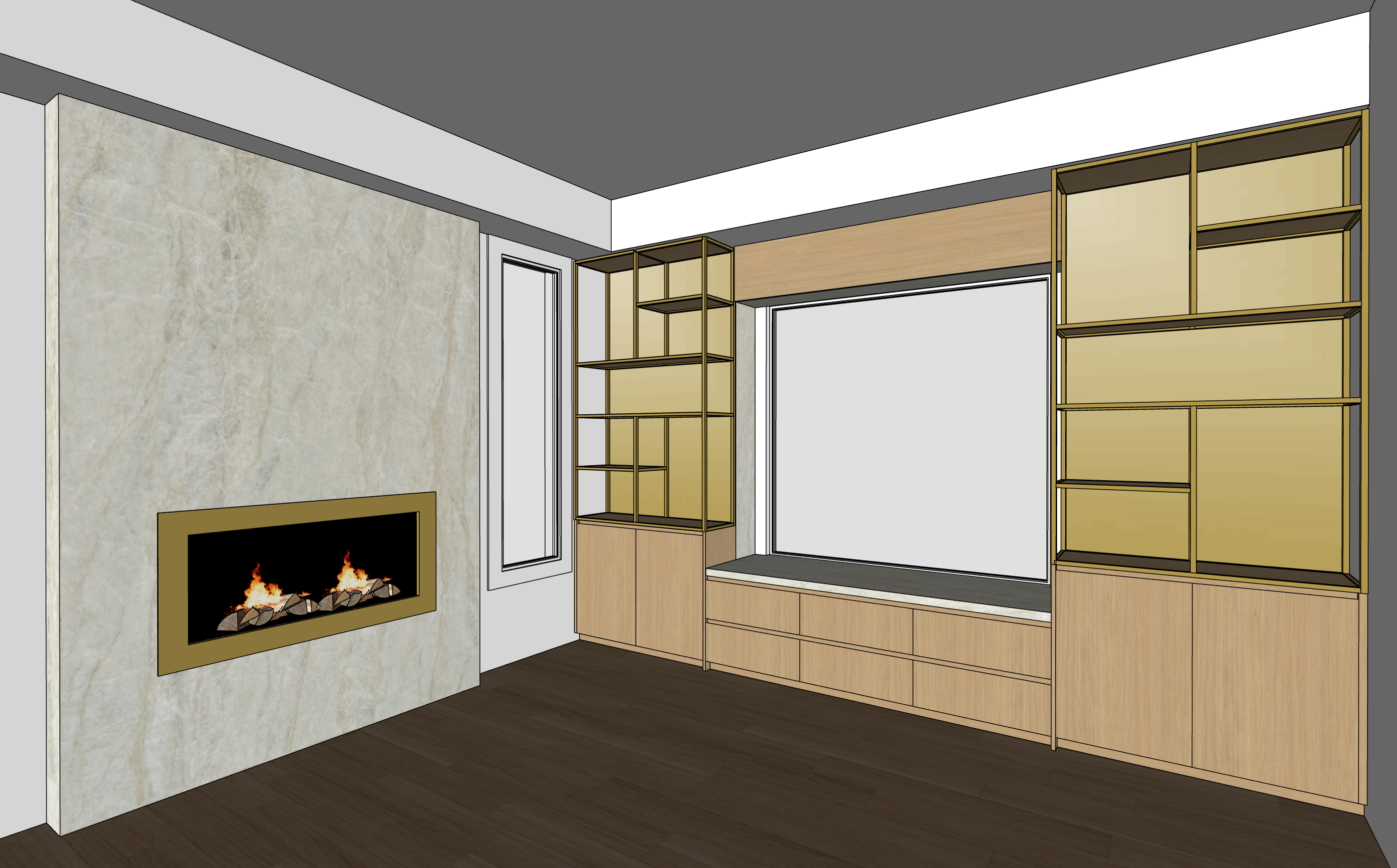 metal shelving is going to be in brass square matal tubes put luxury decor on shelves behind the metal shelving is bronze mirror against the wall the fireplace wall is cladded in dekton nara the bench is going to be the same material as the fireplace cladding the window opening will also have dekton nara in the opening but it will have the wood panel above the window show a street view outside the window windows will have roller blinds half open all the wood grain on the photo provided is a material called master oak light oak