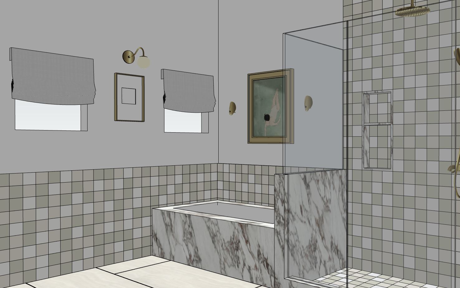 create a photorealistic rendering of this bathroom with soft warm indirect lighting