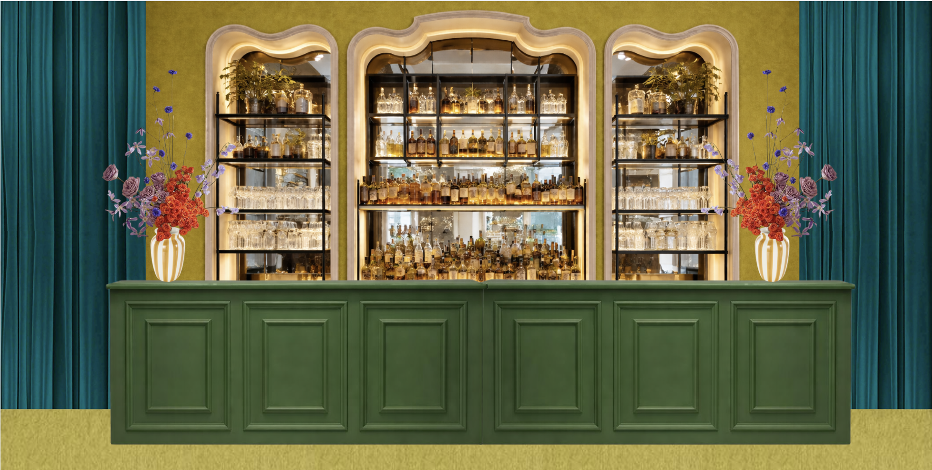 evening after party lighting green painted bar front chrome votive candles on the shelves mixed with clear glassware the shelving unit is painted chartreuse have the shelves lit on the inside walls are teal velvet drape floor is yellow carpet