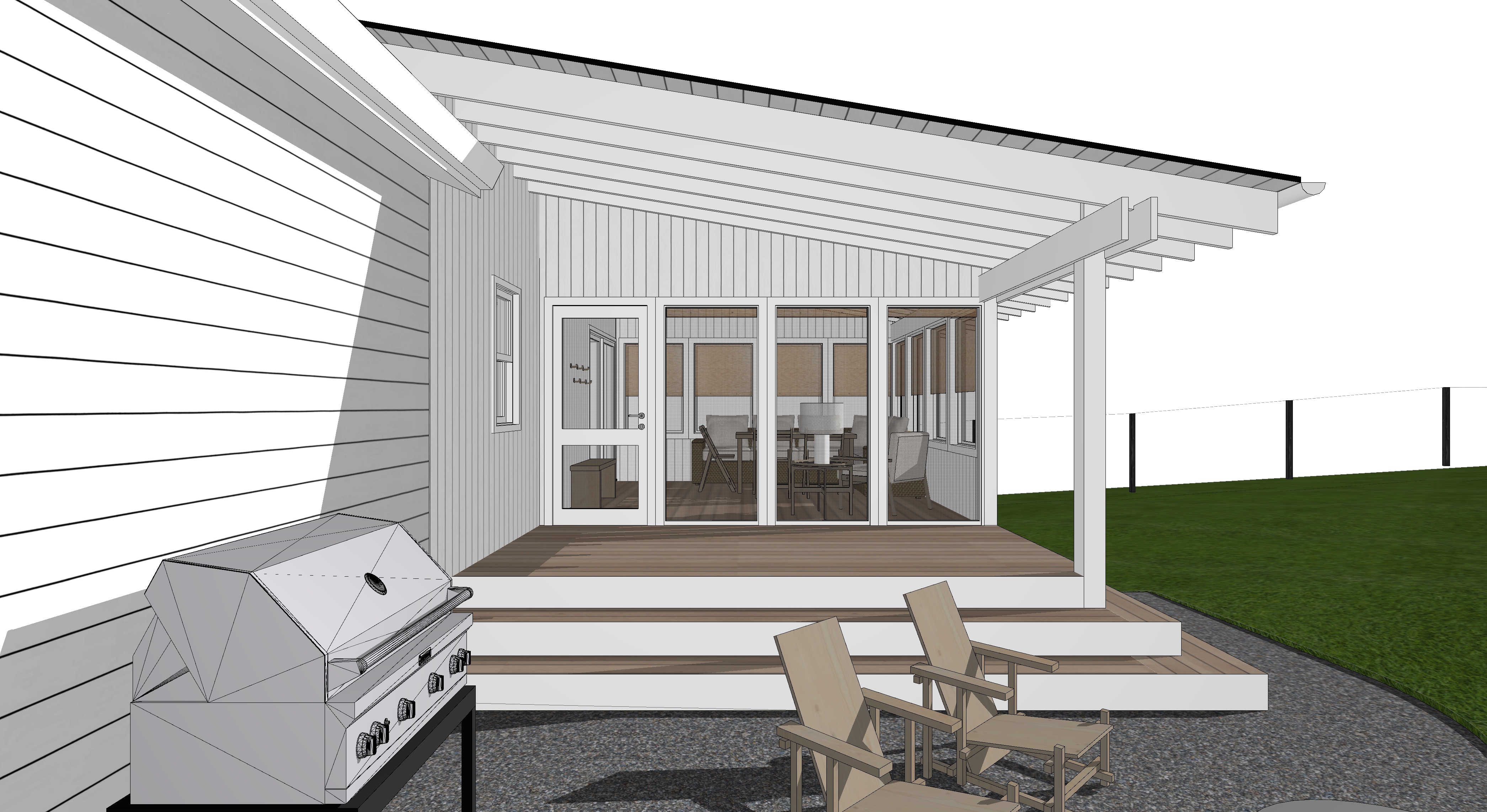 a simple white house and sunroom with a scandinavian design use the provided image as the exact base model and camera view do not change redesign or reinterpret any architecture roof forms window sizes siding layout porch proportions steps grill location or outdoor furniture placement maintain the exact perspective and composition render a photorealistic scandinavian countryside cottage in a calm natural setting architecture materials exterior siding painted soft matte nordic white combination of horizontal lap siding on the left volume and vertical board and batten on the right volume trim and fascia crisp white with subtle shadow lines exposed roof rafters under the extended eave dark charcoal asphalt shingle roof with realistic texture porch deck and steps in natural weathered pine or light oak windows with thin white frames and slightly reflective glass interior glimpses showing warm minimalist scandinavian furnishings outdoor patio area natural gravel patio four scandinavian wood lounge chairs with canvas seats around a round concrete fire pit stainless steel grill near the house minimal black posts for wire fence beyond landscape soft lawn with subtle variation in grass tone gentle rolling terrain woodland in the background rock outcrops on the right edge of the patio natural informal landscaping not manicured lighting golden hour scandinavian summer light low sun creating long warm shadows soft sunlight grazing the siding to highlight wood texture warm interior lights glowing through the windows sky with light clouds and pale blue tones atmosphere calm quiet nordic countryside clean fresh air feeling slight lens bloom from the warm sun subtle depth of field