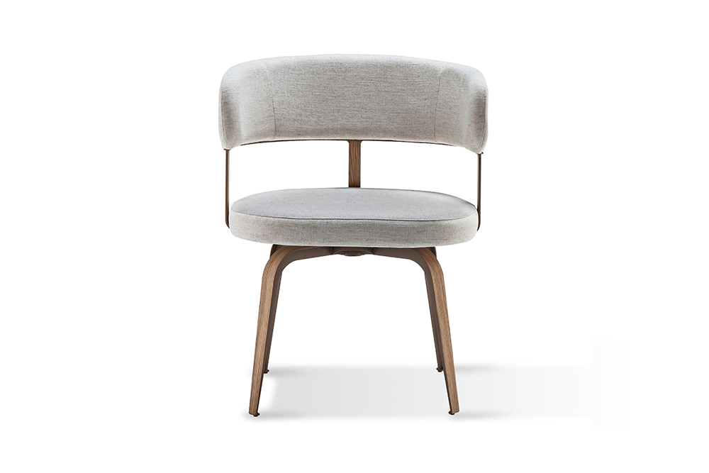 a modern chair with sleek curved lines featuring a soft gray upholstery for both the backrest and seat the chair has a wooden frame with natural warm brown tones highlighting its elegant form set against a minimalistic background the atmosphere should be airy and sophisticated with a gentle light source casting soft shadows emphasizing the chair s texture and design
