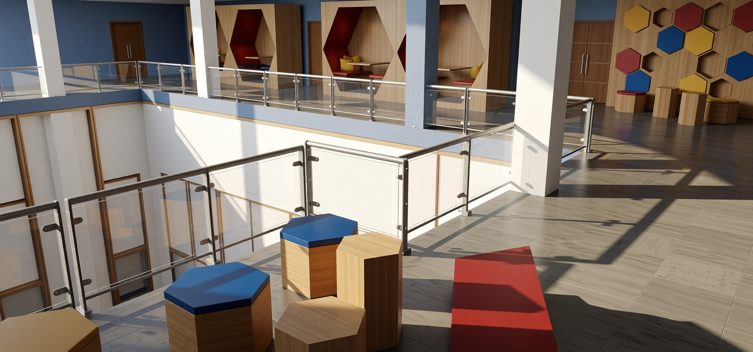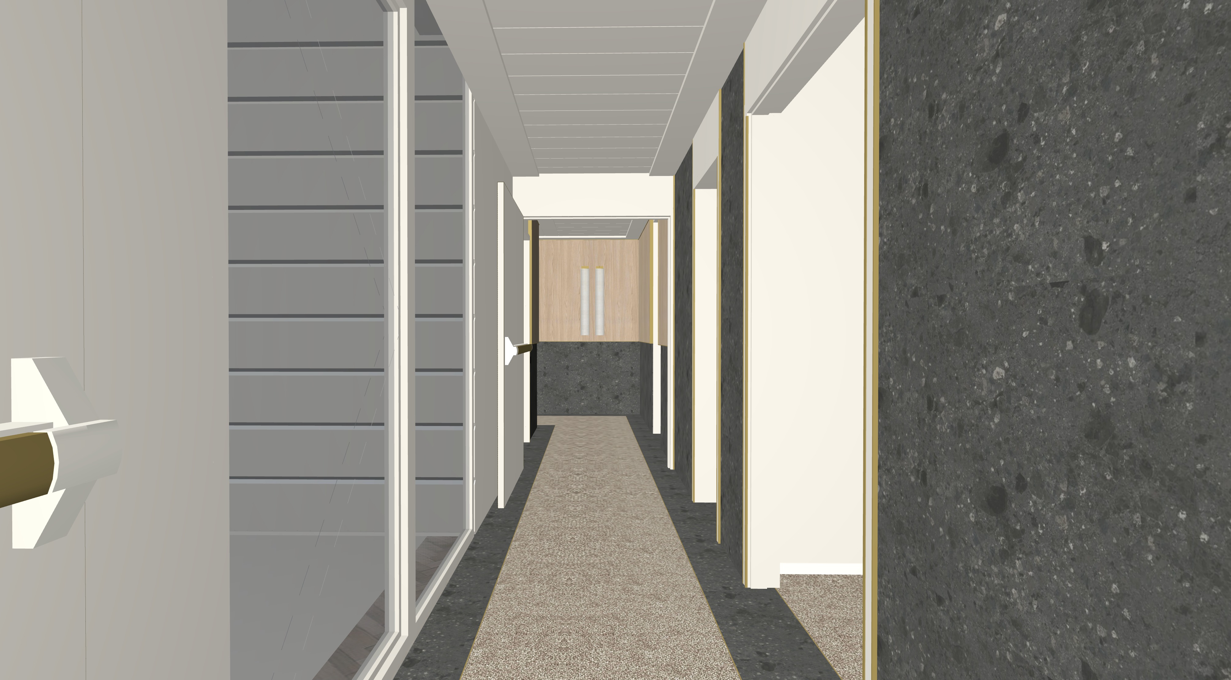inserisci strip led sotto legno rovere le lampade sono solo sul fondo del corridoio e sono due cilindri in tessuto il rivestimento grigio fragmenta nero ombrato ariostea opaco luce naturale dal vetro di sinistra la moquette a terra ha un pelo basso color tortora e leggermente cangiante