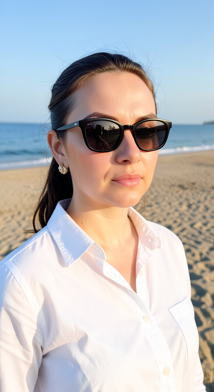 a realistic portrait using the reference image of the same woman her facial features must remain unchanged identity preserved no alteration of face shape proportions or expression she is placed on a wide empty sandy beach with a calm blue ocean in the background under a clear sky she is wearing a light elegant white shirt her regular glasses are replaced with stylish sunglasses her face is gently retouched only smooth clear skin reduced wrinkles even skin tone natural soft finish maintaining realistic texture and avoiding any plastic or artificial look subtle sun kissed glow on the skin natural daylight soft warm sunlight realistic colors gentle depth of field calm beach atmosphere professional portrait photography style negative prompt face distortion altered identity different person unrealistic face plastic skin over retouching blurry low quality unnatural proportions