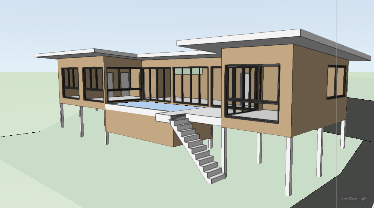 modern tropical villa with soft brown walls pool on the terrace wooden ceilling black roof trim