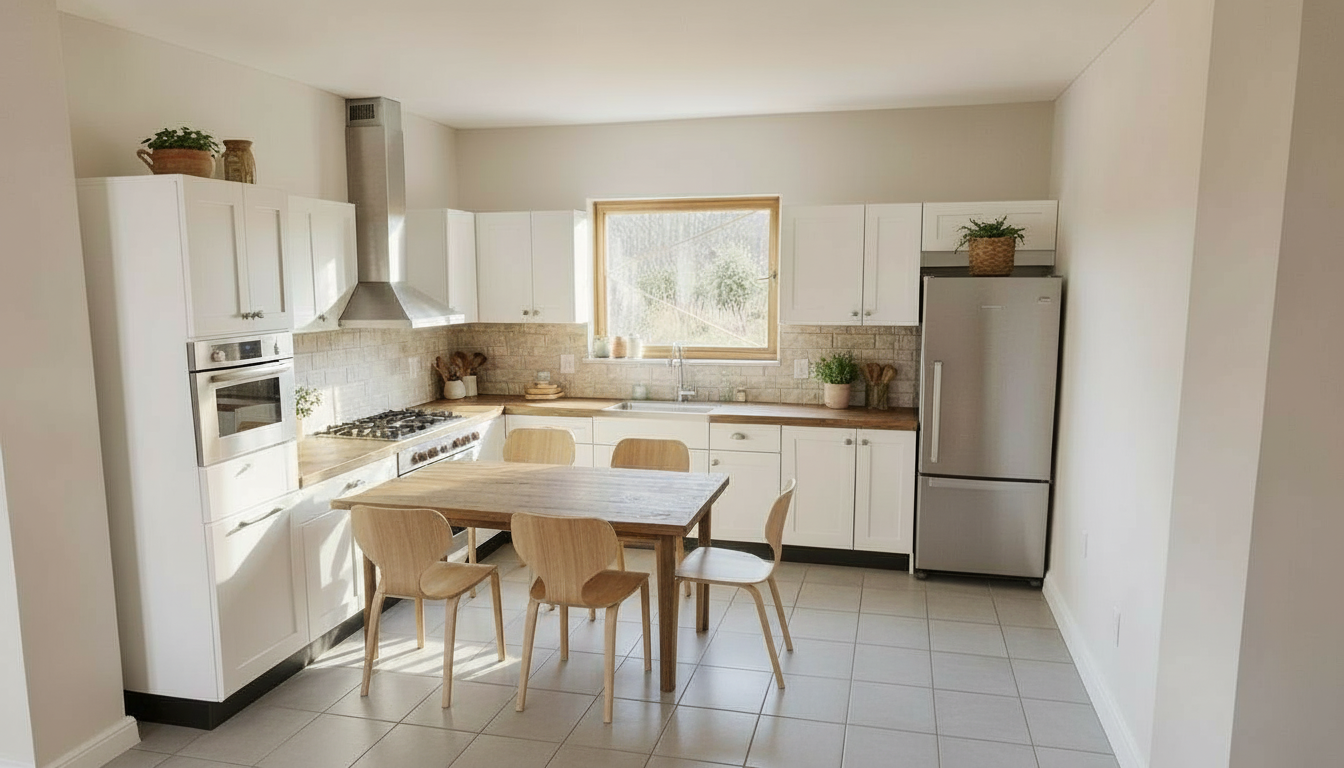 kitchen in oak timber cabinets and gray work top
