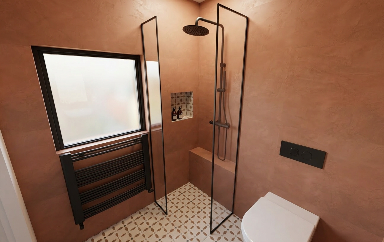 the appartment is on the 6th floor in a parisian building the walls are in very light greige the floor is in black wood the sofa is in taupe the ceiling is in the same color as the walls the espagnolette bolt is in dark bronze add some ancient books on the shelves the tabvle is in travertine the frame of the window is the same color as the walls